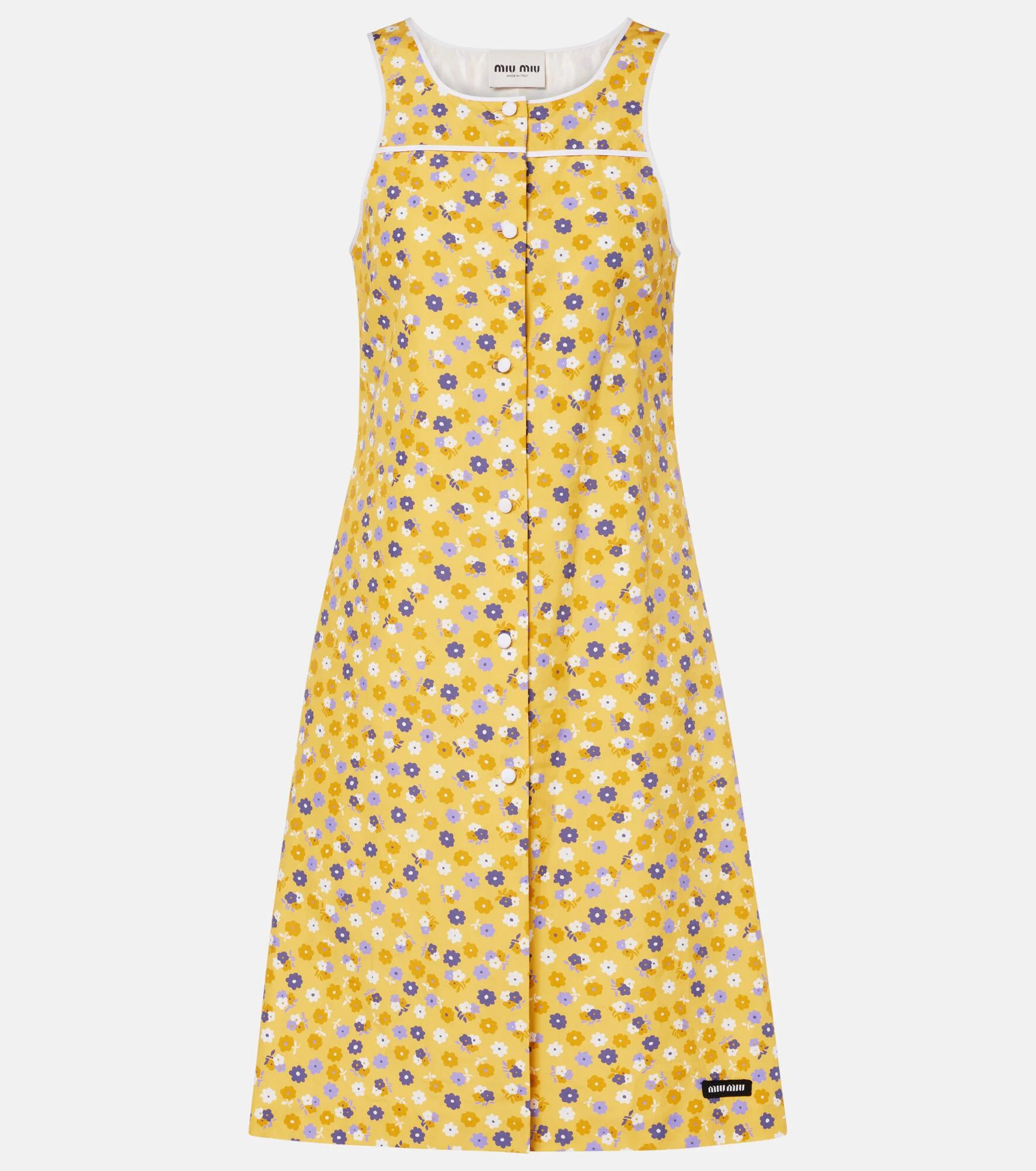 Uninhibited and deliberately subversive: these are the hallmarks of Miuccia Prada’s Miu Miu. Adding retro charm to the look, this cotton poplin midi dress is adorned with an all-over floral print. Product Details - Material: 100% cotton - Care instructions: dry clean - Made in Italy - Color: yellow - Designer color name: Giallo+Viola - Lining: 100% polyester - Closure: buttoned front - Item number: P01178389 Size & Fit - True to size - Designed for a loose fit - Non-stretchy fabric - The model seen in the picture is 178cm-5'10" and wearing a size IT 40