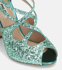 Sparkle with every step when donning these sandals from Miu Miu. An open toe and crisscrossing ankle straps elegantly encase the foot, while a glitter coating in a blue-green hue the label calls "Aqua" lends this Italian-crafted pair an eye-catching finish. Let yours ground evening ensembles with opulent flair. Product Details - Toe shape: round open toe - Lining: leather - Upper: fabric, leather - Sole: leather insole and sole - Closure: buckle-fastening ankle strap - Designer color name: Acqua - Made in Italy - Item number: P00428375 Size & Fit - Fits slightly large to size - we recommend trying a half size smaller - European sizes - 10cm-4" heel (size EU 38)