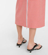 A spin on the classic pencil skirt, this houndstooth-checked design from Miu Miu is a playfully girlish variant, which is guaranteed to catch every eye. Form-fitting and elegant, you can style yours with one of the label's white blouse for an office-ready ensemble that is sure to impress. Product Details - Made in Italy - Material: 100% virgin wool - Closure: zipper fly, button fastening, zipped back - Designer color name: Rosso - Pocket lining: 100% viscose - Care instructions: dry clean - Pockets: zipped pockets - Item number: P00528377 Size & Fit - True to size - High-waisted - The model seen in the picture is 178cm-5'10" and wearing a size IT 40