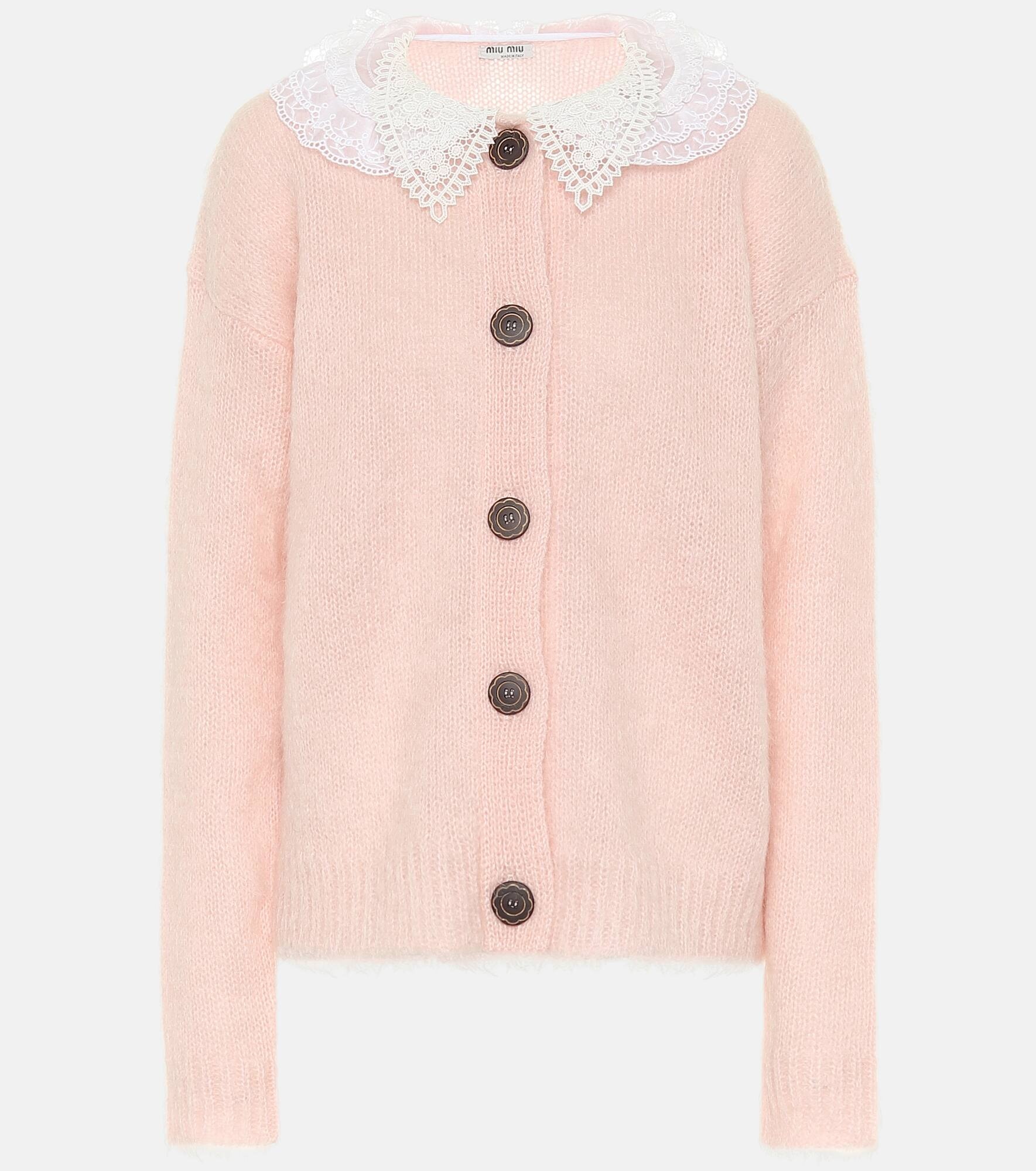An airy white lace collar brings Miu Miu's quintessential charm to this cardigan. Oversized buttons add a further sense of fun to this piece, which makes a sweet impression in pale pink. It looks as soft as it feels, too, as it's spun from a blended knit featuring fuzzy mohair and a touch of wool. Product Details - Trim: 95% cotton, 5% polyester - Made in Italy - Material: 67% mohair, 28% polyamide, 5% wool - Designer color name: Petalo - Closure: buttoned front - Care instructions: dry clean - Item number: P00497517 Size & Fit - True to size - Dropped shoulders - Oversized - Falls to the hip - The model seen in the picture is 178cm-5'10" and wearing a size IT 40