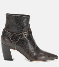 An equestrian-inspired buckle adorns these brown leather ankle boots from Miu Miu. The Italian-made pair has a crackled finish, a pointed toe, and curved block heel. Let yours be your new go-to style this season and pair them with everything from cropped suits to denim. Product Details - Lining: leather - Closure: zipped side - Sole: leather insole and sole - Toe shape: pointed toe - Upper: leather - Designer color name: Ebano - Made in Italy - Item number: P00404128 Size & Fit - True to size - Slightly narrow - European sizes - 8cm-3" heel (size EU 38)