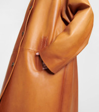 Fresh from the runway, this coat from Miu Miu’s latest collection radiates retro appeal. Made in Italy from supple solarized leather, the design features a shirt collar, wide welt pockets, and a heat-embossed logo patch. Product Details - Lining: 100% viscose, fully lined - Made in Italy - Material: 100% lamb leather - Designer color name: Miele - Closure: buttoned front - Pockets: welt pockets - Comes with garment bag - Care instructions: do not wash - Item number: P00787127 Size & Fit - Fits large to size - we recommend trying one size smaller - Dropped shoulders - Oversized - The model seen in the picture is 178cm-5'10" and wearing a size IT 38