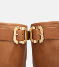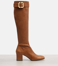 Uninhibited and deliberately subversive: these are the hallmarks of Miuccia Prada’s Miu Miu. Crafted from supremely soft leather, these knee-high boots come with squared toes and branded buckles at the collars. Product Details - Upper: leather - Lining: fabric - Sole: leather insole and sole - Toe shape: round toe - Made in Italy - Includes: shoe box, dust bag - Designer color name: Brown - Item color: brown - Hardware color: gold - Closure: zipped side - Item number: P01131672 Size & Fit - Fits small to size - we recommend trying one size larger - Narrow - Best fit for narrow feet - European sizes - 6,5cm-2.5" heel (size EU 38) - 44cm-17.5" shaft height (size EU 38) - 32cm-12.5" shaft width (size EU 38)