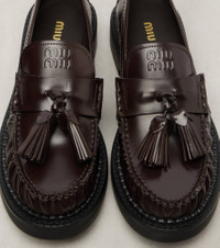 Uninhibited, carefree, and deliberately subversive: these are the hallmarks of Miuccia Prada’s Miu Miu. These polished leather loafers are expertly crafted in Italy with tassels and logo embossing on the uppers. Product Details - Upper: calf leather - Lining: leather - Sole: leather insole, rubber sole - Toe shape: round toe - Made in Italy - Includes: shoe box, dust bag - Designer color name: Moro - Item color: brown - Item number: P01075457 Size & Fit - True to size - For narrow feet, we recommend trying a half size smaller - European sizes - 2cm-1" platform (size EU 38) - 3cm-1" wedge heel (size EU 38)