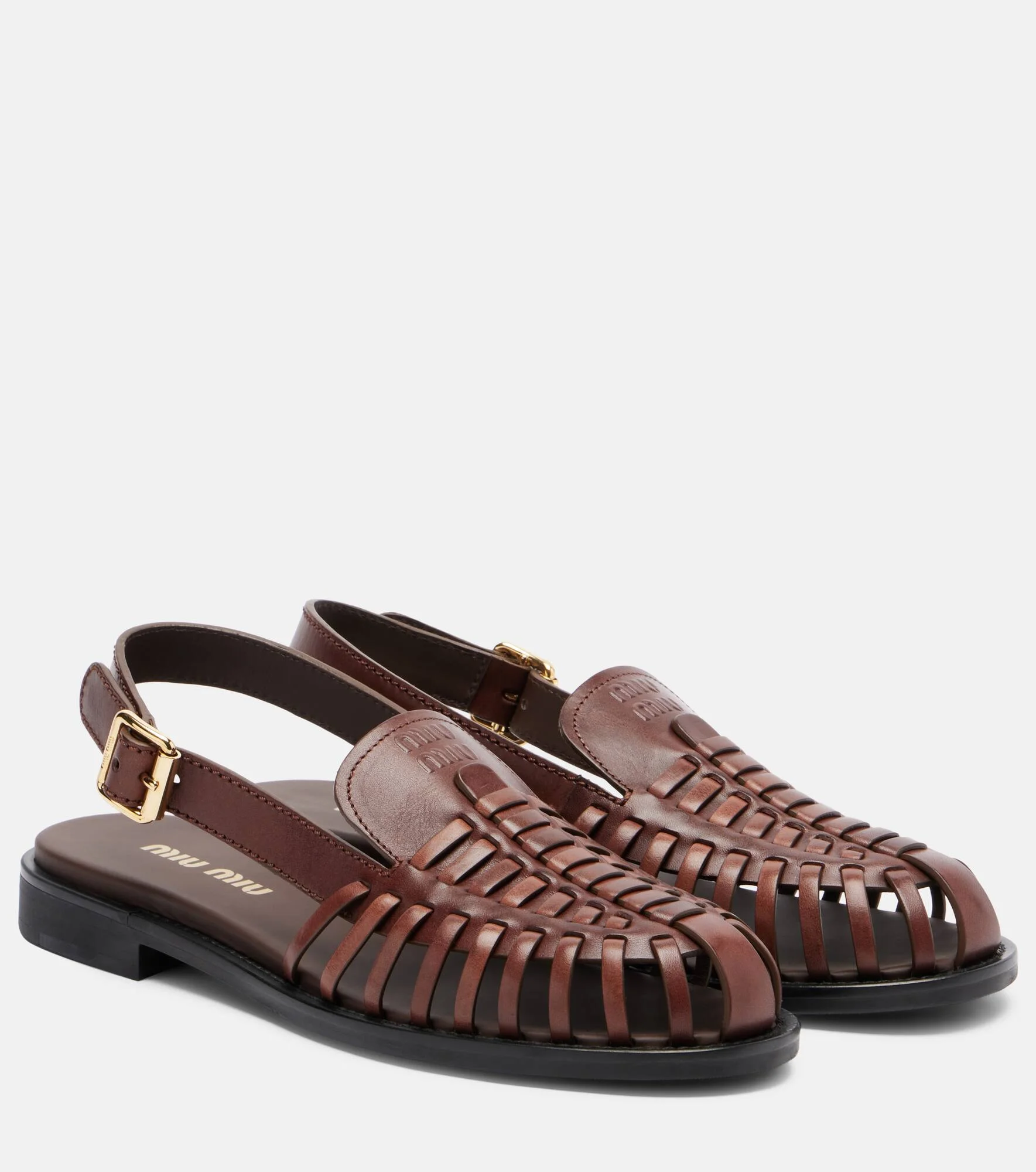 Uninhibited and deliberately subversive: these are the hallmarks of Miuccia Prada’s Miu Miu. These fisherman sandals are Italian-made from brown leather with intricate uppers and slingback buckle straps. Product Details - Upper: calf leather - Lining: leather - Sole: leather insole, rubber sole - Color: brown - Toe shape: round toe - Made in Italy - Includes: shoe box, dust bag - Designer color name: Caffe' - Item number: P01177644 Size & Fit - Fits slightly large to size - we recommend trying a half size smaller - European sizes