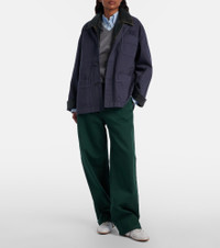 Uninhibited and deliberately subversive: these are the hallmarks of Miuccia Prada’s Miu Miu. This cotton gabardine jacket is an oversized design and features a detachable leather collar. Product Details - Material: 100% cotton - Care instructions: specialist clean - Made in Italy - Color: blue - Designer color name: Ematite - Details: 100% calf leather - Detachable collar - Closure: buttoned front - Pockets: patch pockets - Contains non-textile parts of animal origin - Item number: P01180781 Size & Fit - True to size - Dropped shoulders - Oversized - Non-stretchy fabric - Falls below the hip - The model seen in the picture is 178cm-5'10" and wearing a size IT 40