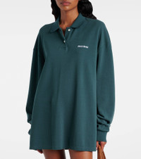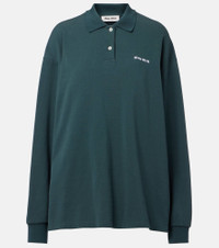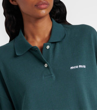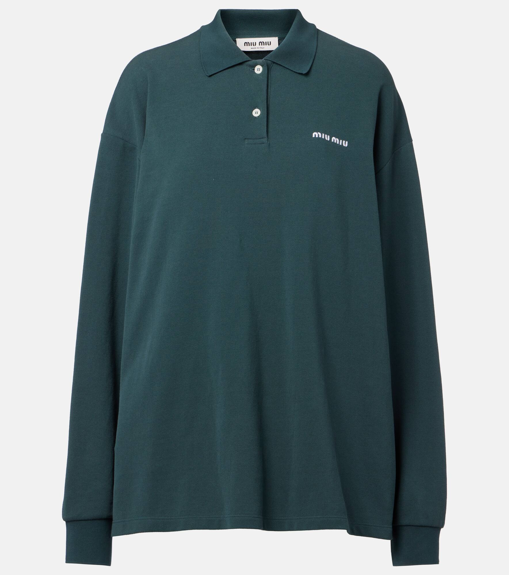 Uninhibited, carefree, and deliberately subversive: these are the hallmarks of Miuccia Prada’s Miu Miu. This polo shirt is made in Italy from cotton pique to an oversized silhouette with a contrast-toned logo in front. Product Details - Material: 100% cotton - Care instructions: dry clean - Made in Italy - Designer color name: Verde - Item color: green - Details: 100% mother-of-pearl - Collar: polo collar - Closure: partially buttoned front - Side slits - Sleeves: long-sleeved - Contains non-textile parts of animal origin - Item number: P01037982 Size & Fit - True to size - Dropped shoulders - Straight fit - Non-stretchy fabric - Falls below the hip - The model seen in the picture is 178cm-5'10" and wearing a size XS