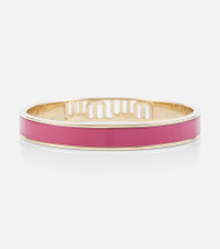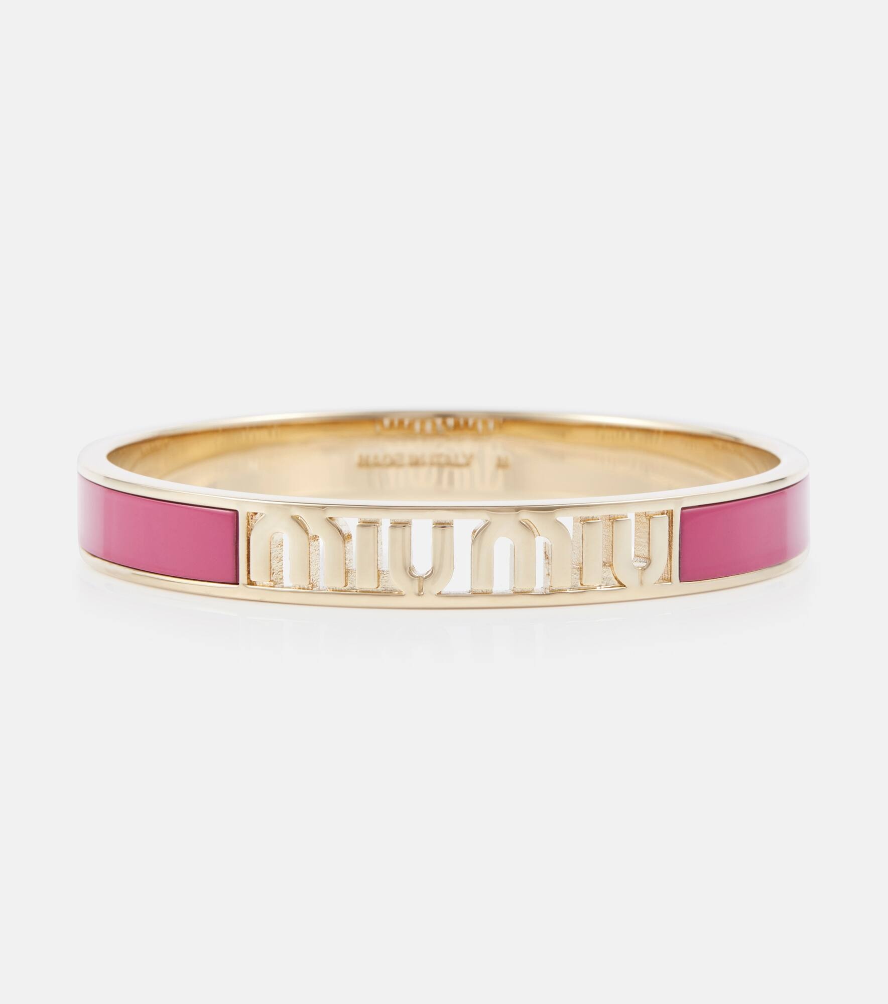 Showcase your devotion to Miu Miu with this golden brass bracelet. Its enameled in eye-catching pink and features a cutout-effect logo. Product Details - Made in Italy - Material: brass - Designer color name: Fuxia - Item number: P00710912 Size & Fit - Width 1cm-0.5" - Circumference size M 20cm-8"