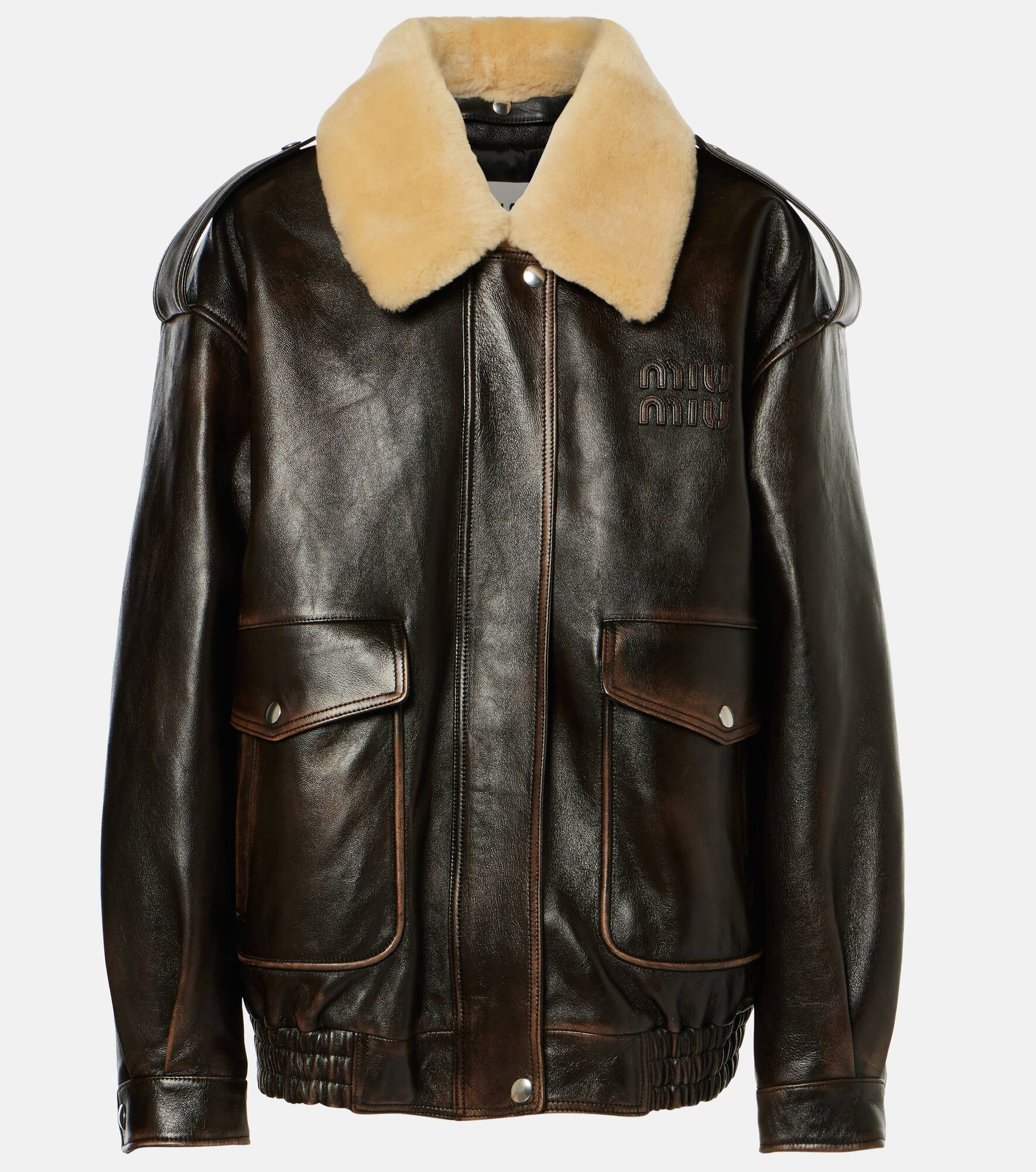 Product Details - Material: 100% lamb leather - Care instructions: do not wash - Made in Italy - Designer color name: Caffe - Item color: brown - Cuff: buttoned - Closure: zipped front - Pockets: patch pockets, side slit pockets - Material II: 100% polyester - Trim: 100% faux shearling - Item number: P00966777 Size & Fit - True to size - Dropped shoulders - Elasticated hem - Non-stretchy fabric - Falls below the hip - The model seen in the picture is 178cm-5'10" and wearing a size IT 40
