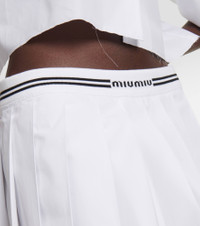 Miu Miu taps into trending tennis styles with this pleated miniskirt. The pleated style is made from crisp cotton-blend poplin with intarsia-knit logo detailing at the waistline and a raw hemline. Product Details - Material: 100% cotton - Care instructions: dry clean - Made in Italy - Designer color name: Bianco - Item number: P00851545 Size & Fit - Fits large to size - we recommend trying one size smaller - Elasticated waist - Sits low on the hips - The model seen in the picture is 178cm-5'10" and wearing a size IT 38