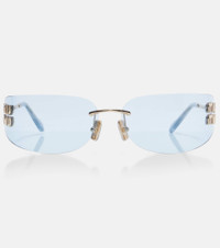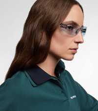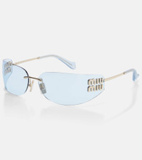 Uninhibited, carefree, and deliberately subversive: these are the hallmarks of Miuccia Prada’s Miu Miu. Case in point, these rectangular sunglasses feature a rimless design, with the brand name boldly lettered across the sides. Product Details - Frame material: metal - Frame color: gold - Lens filter category 1 - Lens color: blue - Made in Italy - Includes: case and presentation box, cleaning cloth - Designer color name: Blue - Item number: P00992613 Size & Fit - Lens width: 75mm-2.95" - Bridge size: 14mm-0.55" - Earpiece length: 110mm-4.35"