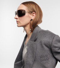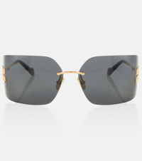 Uninhibited, carefree, and deliberately subversive: these are the hallmarks of Miuccia Prada’s Miu Miu. Seen on the runway, these rectangular sunglasses have a rimless silhouette with gold-tone logo sides and gray UV-protective lenses. Product Details - Frame material: metal - Frame color: gold - lens filter category 3 - Lens color: black - Made in Italy - Lens type: tinted lenses - comes with cleaning cloth - comes with a case and presentation box - the color of the case may vary - Item number: P00837227 Size & Fit - Lens width: 80mm-3.15" - Bridge size: 14mm-0.55" - Earpiece length: 110mm-4.35"