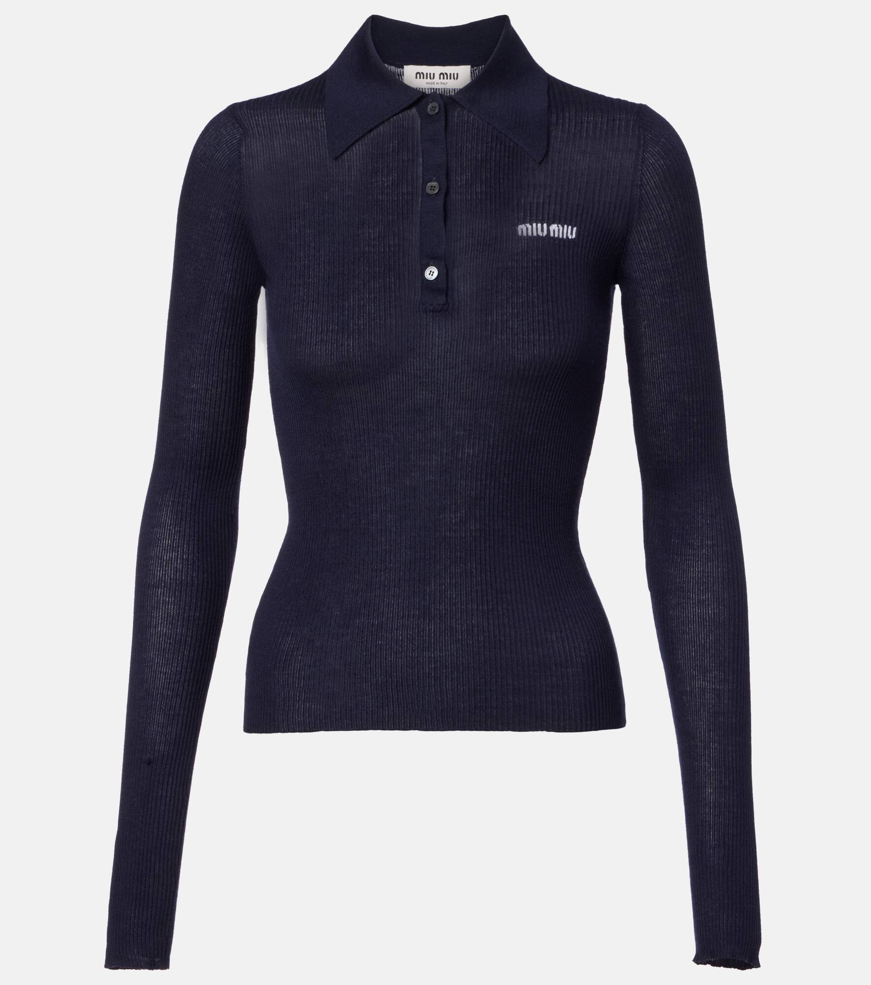 Uninhibited and deliberately subversive: these are the hallmarks of Miuccia Prada’s Miu Miu. This polo shirt is crafted from cashmere and silk and boasts a ribbed-knit finish and a logo detail on the chest. Product Details - Material: 70% cashmere, 30% silk - Care instructions: dry clean - Made in Italy - Designer color name: Blue - Item color: blue - Contains non-textile parts of animal origin - Collar: polo collar - Closure: buttoned placket - Item number: P01131030 Size & Fit - True to size - Semi-sheer - Fitted - Stretchy fabric - Falls below the hip - The model seen in the picture is 178cm-5'10" and wearing a size IT 40