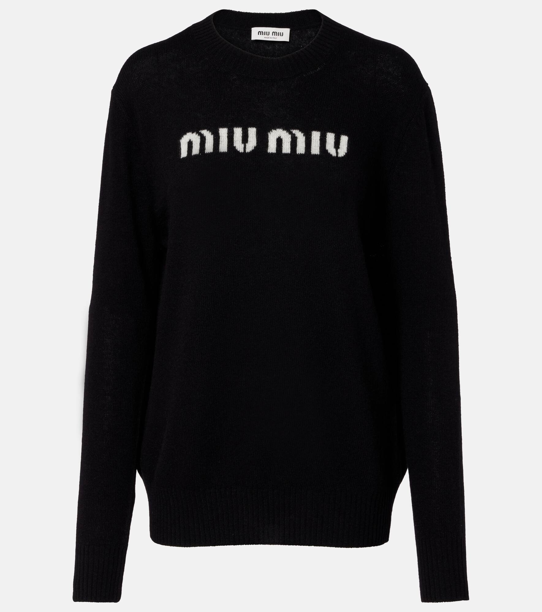 This Miu Miu sweater is a cold-weather staple for well-curated wardrobes. Made in Italy from wool and cashmere, the piece is designed with a relaxed silhouette and boasts the unmistakable logo at the front. Product Details - Material: 70% wool, 30% cashmere - Care instructions: dry clean - Made in Italy - Designer color name: Black - Item color: black - Collar: crewneck - Cuff: ribbed - Hem: ribbed - Item number: P01116671 Size & Fit - True to size - Designed for a loose fit - Slightly stretchy fabric - Falls below the hip - The model seen in the picture is 178cm-5'10" and wearing a size IT 40