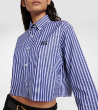Miu Miu has mastered the art of creating perfectly feminine pieces, as proven again by this shirt. This long-sleeved piece is made from cotton and is designed to be cropped. Product Details - Made in Italy - Material II: 56% polyester (recycled), 44% polyurethane - Care instructions: machine wash at 30 degrees - Designer color name: Bleu - Buttoned cuffs - Closure: buttoned placket - Material: 100% cotton - Item number: P00753001 Size & Fit - True to size - Dropped shoulders - Oversized - Cropped - The model seen in the picture is 178cm-5'10" and wearing a size IT 40