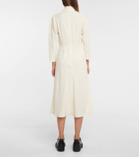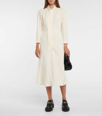 This midi dress from Miu Miu exudes romantic charm with its self-tie ribbon at the neckline. In a fluid and slightly flared length, this style comes in a cream colorway. Product Details - Made in Italy - Closure: zipped back - Material: 74% acetate, 26% viscose - Designer color name: Crema - Care instructions: dry clean - Self-tie collar - Item number: P00594853 Size & Fit - Fits large to size - we recommend trying one size smaller - Semi-sheer - Cinched waist - The model seen in the picture is 178cm-5'10" and wearing a size IT 38
