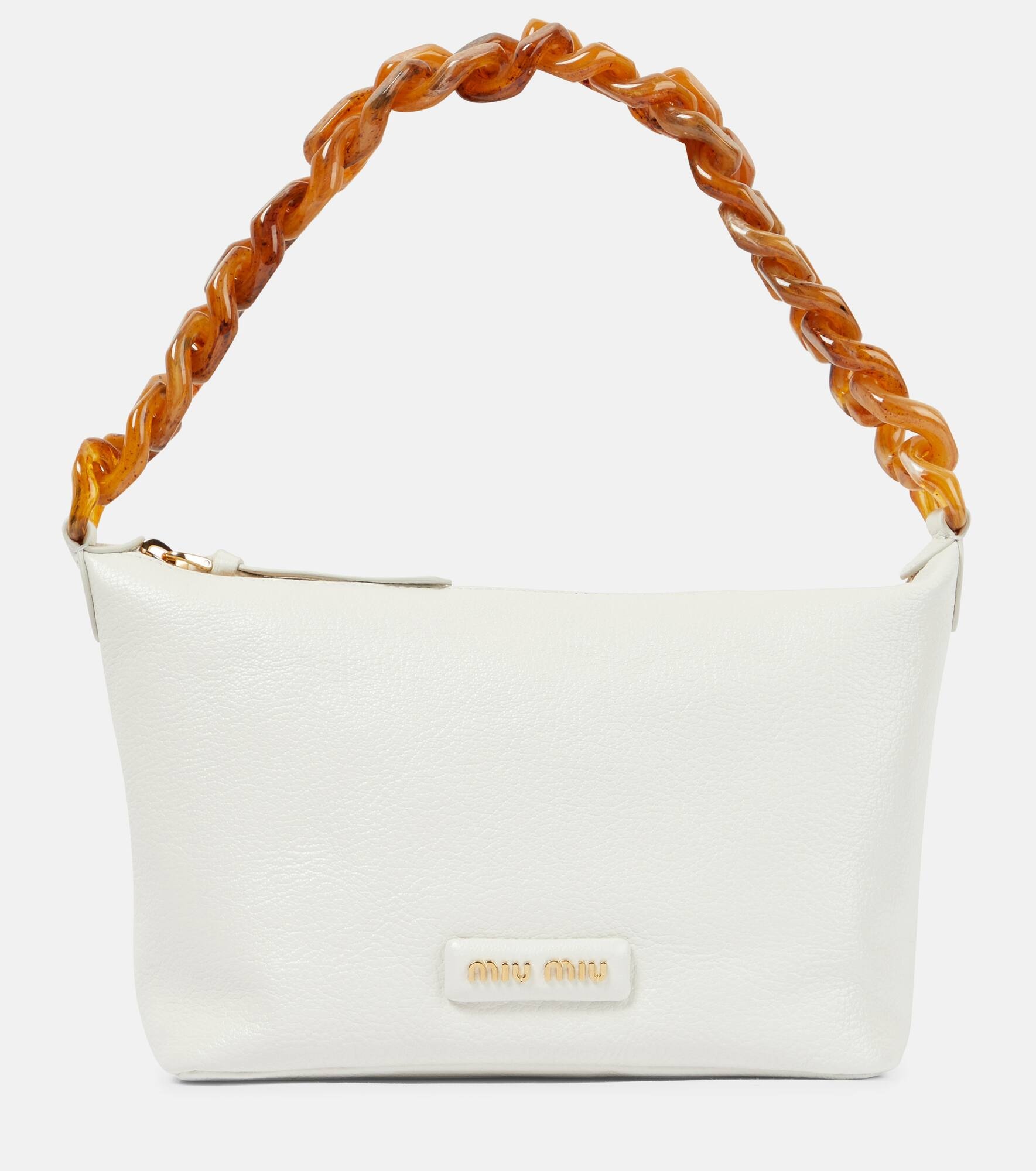 The Miu Spirit shoulder bag from Miu Miu will be your favorite daily accessory. It's made from textured leather and features a jade-inspired acrylic chain strap. Product Details - Closure: zipped top - Color of fastening: gold - Designer color name: Bianco T - Internal details: internal zipped pocket, fabric lining - Made in Italy - Comes with dust bag - Chain shoulder strap - Material: goat leather - Item number: P00636662 Size & Fit - Height 14cm-5.5" - Width 23cm-9" - Depth 10cm-4" - Length of handle 48cm-19"