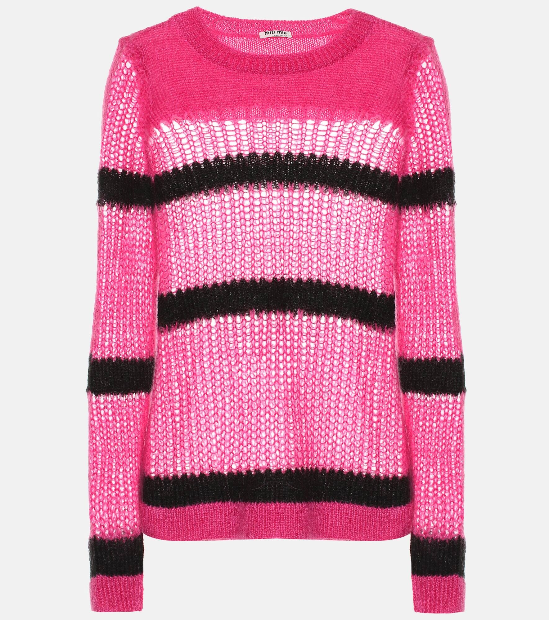 Pop some color into your cozy edit with this loose-knit, mohair-blend sweater from Miu Miu. Crafted in Italy in a vibrant pink hue, the relaxed-fit design features ribbed knitting on the round neck, cuffs, and hem. Match the contrasting black stripes to a pair of work trousers for a comfortable day at the office. Product Details - Material: 67% mohair, 28% polyamide, 5% wool - Care instructions: dry clean - Made in Italy - Designer color name: Fuxia + Nero - Item number: P00405899 Size & Fit - True to size - Semi-sheer - Designed for a loose fit - Falls to the hip - The model seen in the picture is 178cm-5'10" and wearing a size IT 40