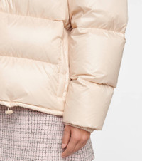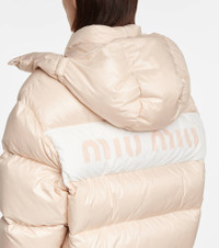 This light orange jacket is how the Miu Miu girl will stay warm this winter. Made from nylon technical fabric that's quilted and filled with down for insulation, it has practical features such as a detachable hood, elasticated cuffs and a drawcord waist. Product Details - Material: 100% polyamide - Filling: 90% down, 10% feathers - Designer color name: Cammeo - Drawstring hood - Lining: 100% polyamide, fully lined - Closure: snap-buttoned fastenings, zipped front - Pocket lining: 100% polyester - Detachable hood - Care instructions: dry clean - Elasticated cuffs - Pockets: zipped pockets - Item number: P00594932 Size & Fit - Fits large to size - we recommend trying one size smaller - Dropped shoulders - Designed for a loose fit - Thick material - Falls to the hip - The model seen in the picture is 178cm-5'10" and wearing a size IT 38