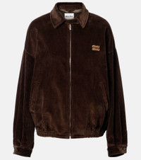 Uninhibited and deliberately subversive: these are the hallmarks of Miuccia Prada’s Miu Miu. This blouson jacket is made from cotton corduroiy with a contrasting leather logo, a zipped front, and an elasticated waistband. Product Details - Material: 100% cotton - Care instructions: dry clean - Made in Italy - Color: brown - Designer color name: Cacao - Item color: brown - Lining: 100% viscose - Closure: zipped front - Pockets: welt pockets - Cuff: one button - Hem: elasticated - Item number: P01146451 Size & Fit - True to size - Dropped shoulders - Elasticated hem - Oversized - Non-stretchy fabric - Falls below the hip - The model seen in the picture is 178cm-5'10" and wearing a size IT 40