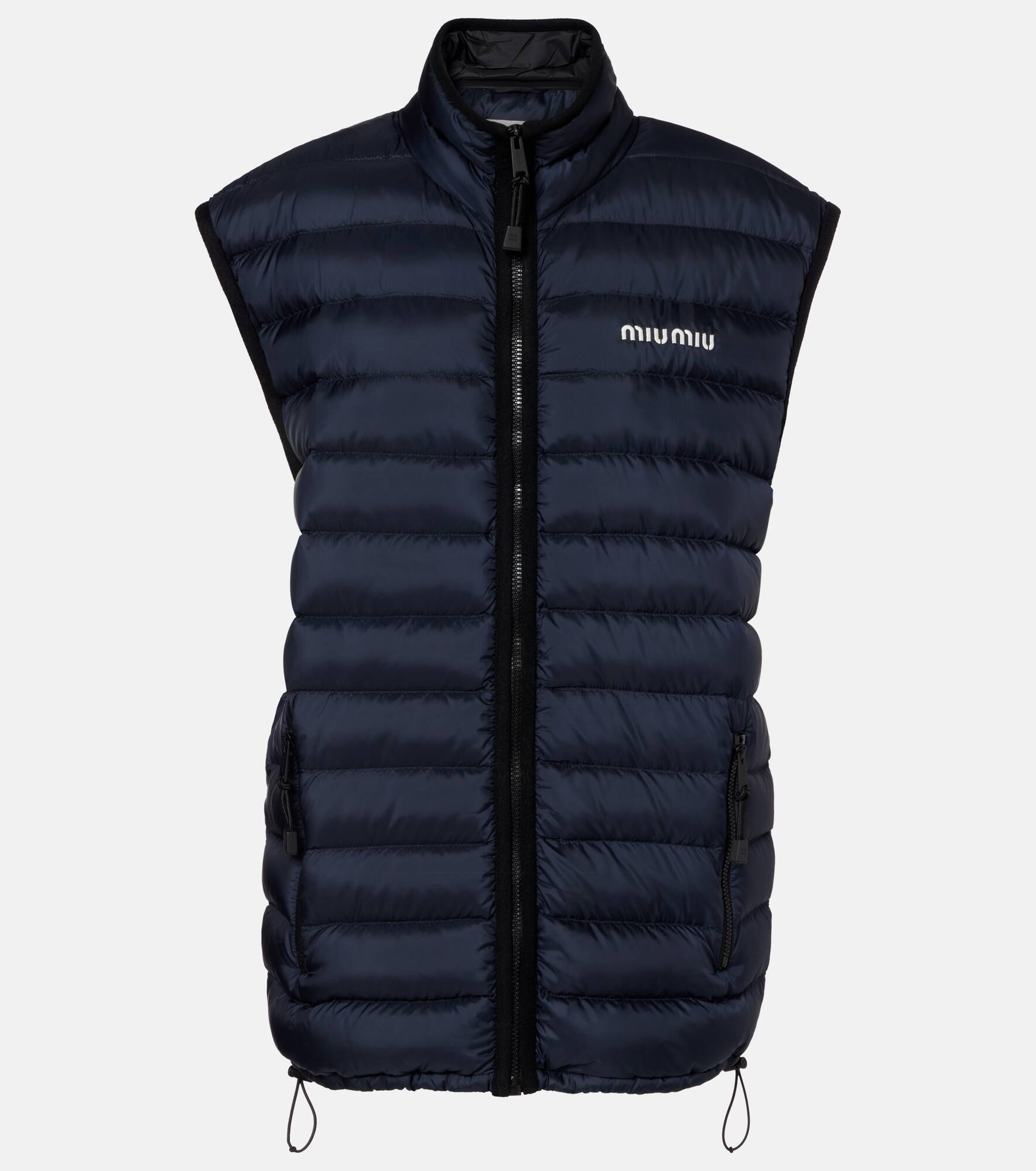 Miu Miu's rebellious spirit is encapsulated in this lightweight down vest. Made from fleece and fine pongee, this paneled style features a drawstring waist to optimize comfort and functionality. Product Details - Material: 100% polyester (recycled) - Care instructions: hand wash - Made in Romania - Designer color name: Bleu - Item color: blue - Filling: 90% down, 10% goose feathers - Closure: zipped front - Pockets: zipped pockets - Drawstring waist - Item number: P01069708 Size & Fit - True to size - Adjustable hem - Oversized - Thick material - Non-stretchy fabric - Falls below the hip - The model seen in the picture is 178cm-5'10" and wearing a size IT 40