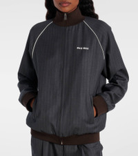 The classic pinstripe pattern takes a modern direction with this Miu Miu blouson. Crafted from virgin wool, this zip-up style features piping and a cropped silhouette that recalls a tracksuit jacket. Product Details - Material: 100% virgin wool - Care instructions: dry clean - Made in Italy - Designer color name: Ardesia - Item color: gray, brown - Trim: 82% polyamide (recycled), 15% polyamide, 3% elastane - Lining: 100% viscose - Closure: zipped front - Pockets: side slit pockets - Cuff: elasticated - Hem: elasticated - Item number: P01069696 Size & Fit - True to size - Elasticated hem - Oversized - Non-stretchy fabric - Falls below the hip - The model seen in the picture is 178cm-5'10" and wearing a size IT 40
