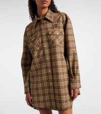 Uninhibited, carefree, and deliberately subversive: these are the hallmarks of Miuccia Prada’s Miu Miu. Crafted from virgin wool, this plaid shirt is cut to an oversized silhouette and features buttoned front closure and chest pockets. Product Details - Material: 100% virgin wool - Care instructions: dry clean - Made in Italy - Designer color name: Cammello+Tabacco - Item color: beige, brown - Collar: classic (Straight point) - Closure: snap-buttoned front - Pockets: snap-buttoned pockets - Cuff: buttoned - Item number: P01069687 Size & Fit - True to size - Dropped shoulders - Oversized - Non-stretchy fabric - Falls below the hip - The model seen in the picture is 178cm-5'10" and wearing a size IT 40