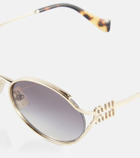 Sun-shielding style made easy, these Miu Miu sunglasses are shaped with rounded frames with logo detailing at the temples. This golden pair is finished with tinted lenses and tortoiseshell trims at the arms. Product Details - Frame material: metal - Frame color: gold - Lens filter category 2 - Lens color: black - Made in Italy - Includes: case and presentation box, cleaning cloth - The color of the case may vary - Item number: P00813199 Size & Fit - Lens width: 54mm-2.15" - Bridge size: 21mm-0.85" - Earpiece length: 125mm-4.9"