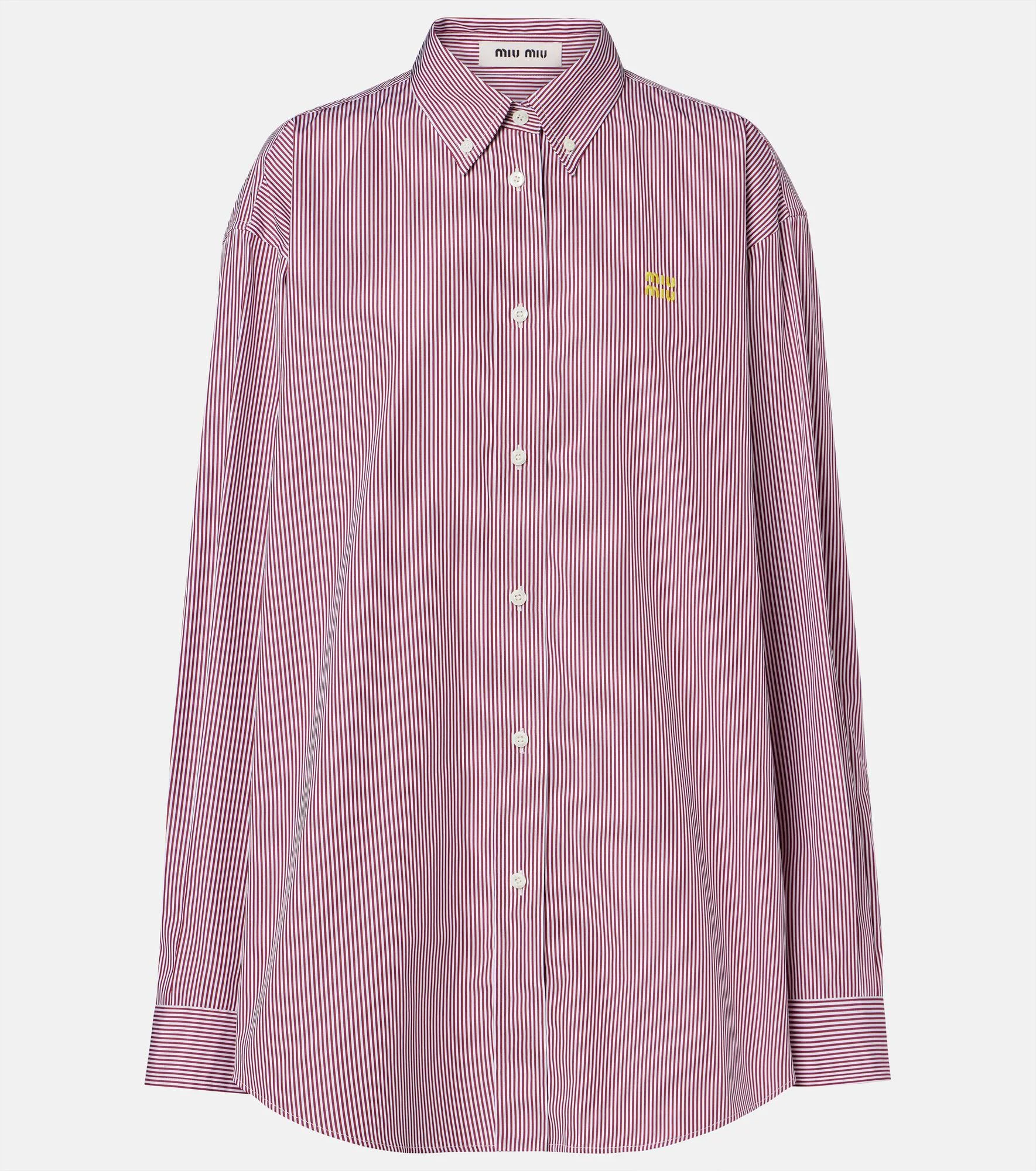 Uninhibited and deliberately subversive: these are the hallmarks of Miuccia Prada’s Miu Miu. This shirt is made from pure, striped cotton into an oversized silhouette with a curved hem and vibrant logo detailing at the chest. Product Details - Material: 100% cotton - Care instructions: dry clean - Made in Italy - Color: red - Designer color name: Bianco+Rosso - Contains non-textile parts of animal origin - Collar: button-down - Cuff: buttoned - Closure: buttoned front - Item number: P01176365 Size & Fit - True to size - Dropped shoulders - Oversized - Non-stretchy fabric - Falls below the hip - The model seen in the picture is 178cm-5'10" and wearing a size IT 40