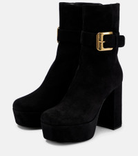 These platform ankle boots from Miu Miu will add depth to your cold-weather edit with their full suede uppers. The block-heeled design has squared toes and belted ankle cuffs affixed with a gold-toned buckle. Product Details - Lining: leather - Closure: zipped side - Toe shape: square toe - Upper: goat leather - Sole: leather insole, leather and rubber sole - Designer color name: Nero - Comes with a box - Made in Italy - Comes with dust bag - Item number: P00720713 Size & Fit - Fits slightly small to size - we recommend trying a half size larger - Slightly narrow at the back - European sizes - 11cm-4.5" heel (size EU 38) - 4,5cm-2" platform (size EU 38)