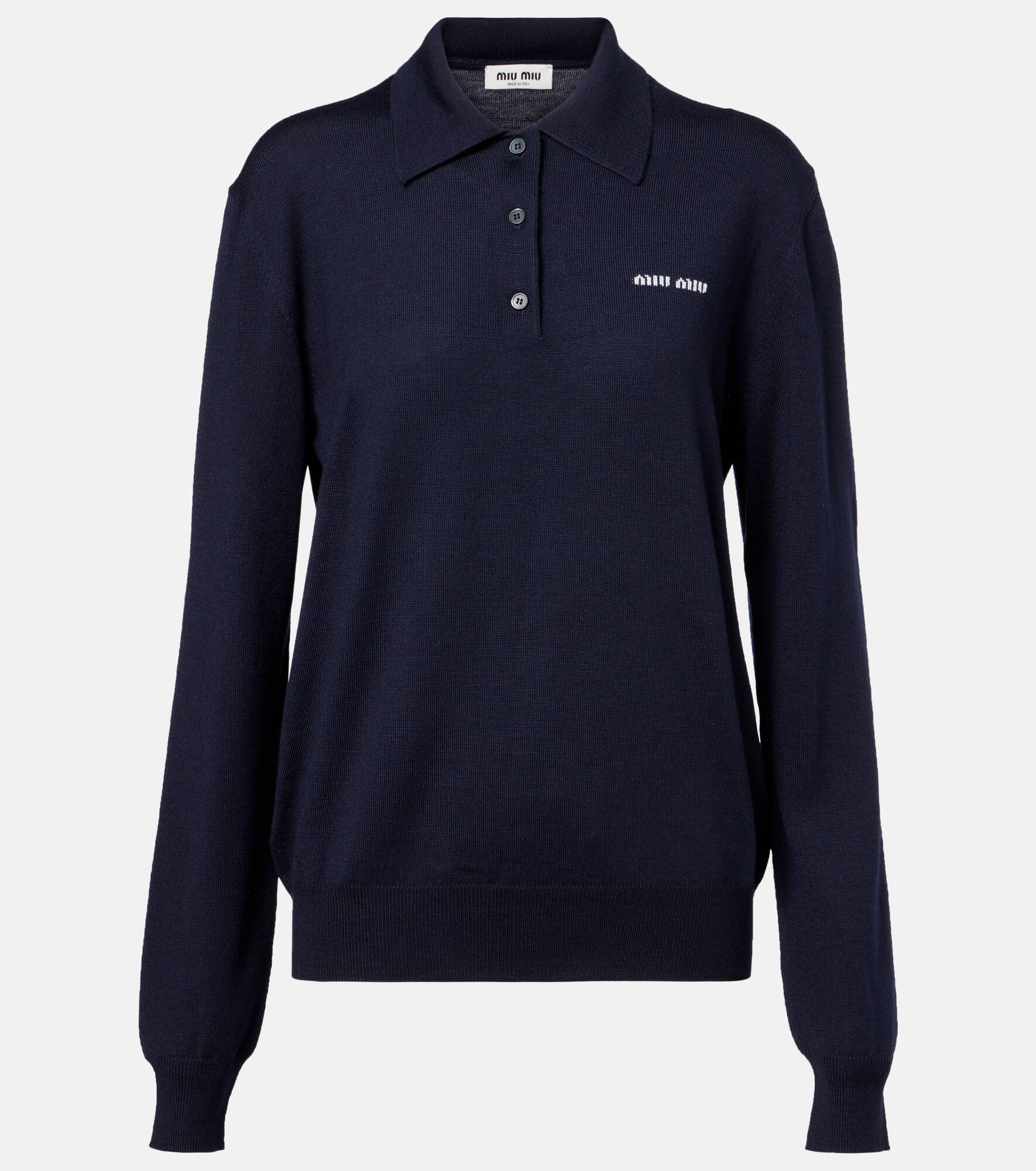 Uninhibited, carefree, and deliberately subversive: these are the hallmarks of Miuccia Prada’s Miu Miu. This polo sweater is knitted in Italy from virgin wool and features the brand's logo at the heart. Product Details - Material: 100% virgin wool - Care instructions: dry clean - Made in Italy - Designer color name: Blue - Item color: blue - Contains non-textile parts of animal origin - Closure: partially buttoned front - Collar: polo collar - Cuff: ribbed - Hem: ribbed - Item number: P01101716 Size & Fit - True to size - Dropped shoulders - Designed for a loose fit - Stretchy fabric - Falls below the hip - The model seen in the picture is 178cm-5'10" and wearing a size IT 40