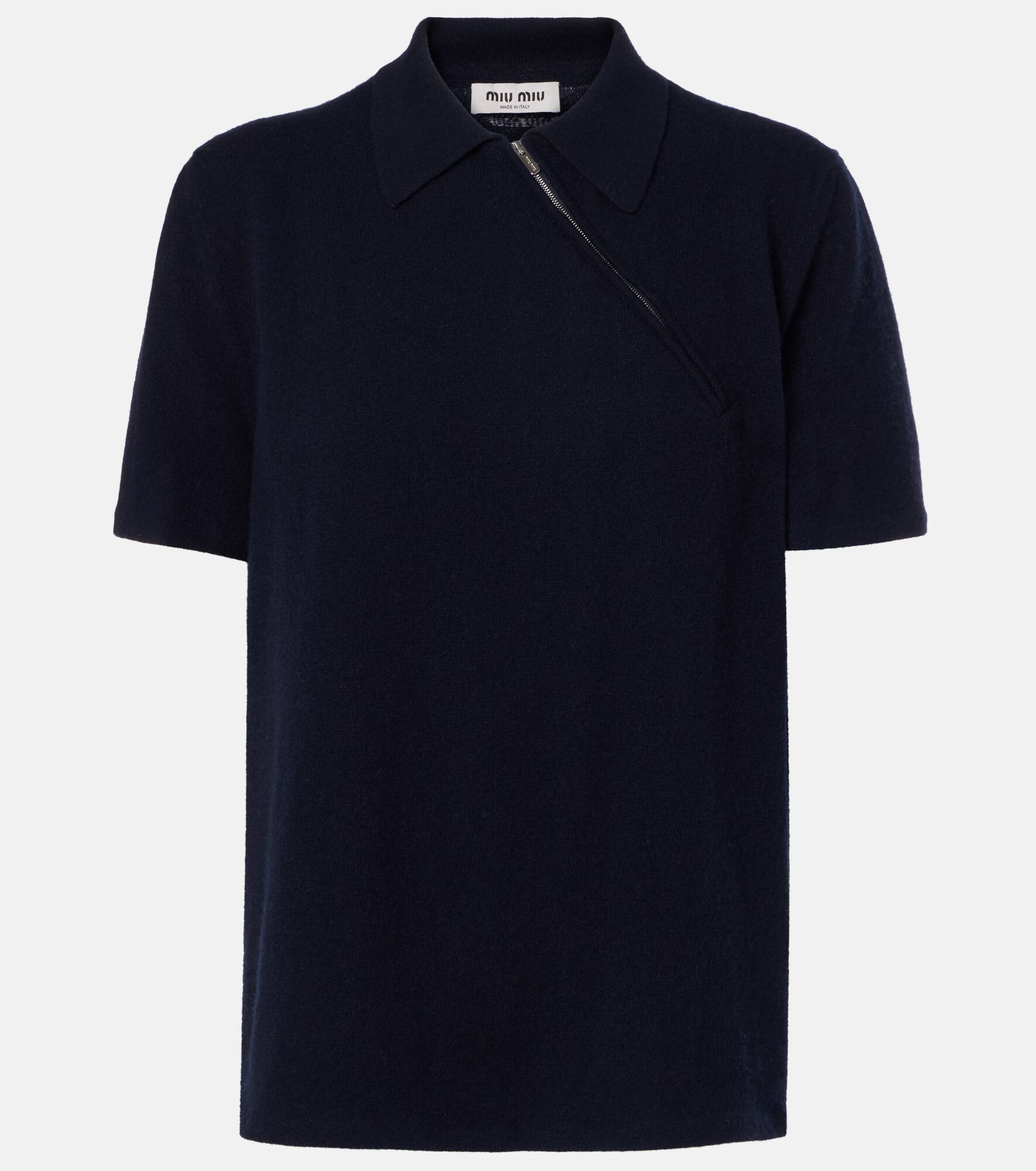 Uninhibited, carefree, and deliberately subversive: these are the hallmarks of Miuccia Prada’s Miu Miu. This cashmere polo shirt challenges fashion norms with a slanted zip-detail at the collar. Product Details - Material: 100% cashmere - Care instructions: dry clean - Made in Italy - Designer color name: Bleu - Item color: blue - Collar: polo collar - Closure: partially zipped front - Item number: P01117293 Size & Fit - True to size - Designed for a loose fit - Falls below the hip - The model seen in the picture is 178cm-5'10" and wearing a size IT 40