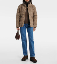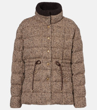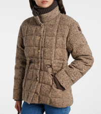 Inspired by classic tailoring fabrics, the Antigony down jacket from Moncler is presented in wool-blend with a quilted finish. The design ensures maximum insulation with a ribbed-knit high collar and a drawstring waistband. Product Details - Material: 58% wool, 24% polyamide, 18% lyocell - Care instructions: dry clean - Made in Moldova - Designer color name: F20 - Item color: brown, beige - Hardware color: gold - Lining: 100% polyester - Filling: 90% down, 10% feathers - Details: 100% calf leather - Contains non-textile parts of animal origin - Closure: snap-buttoned front - Pockets: zipped pockets - Drawstring waist - Item number: P01101128 Size & Fit - Fits large to size - we recommend trying one size smaller - Loose fit, drawstring waist - Non-stretchy fabric - Falls to the hip - The model seen in the picture is 178cm-5'10" and wearing a size 00