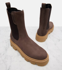 Brown suede boots are a wardrobe essential and these Moncler ones are ultimate transseasonal pair. The style features a classic Chelsea silhouette with pull tabs and elasticated sides for ease of wear. Product Details - Upper: leather (suede) - Lining: leather - Sole: fabric insole, rubber sole - Toe shape: round toe - Made in Italy - Includes: shoe box - Designer color name: 258 - Item color: brown - Closure: elasticated sides - Item number: P01074964 Size & Fit - Fits slightly large to size - we recommend trying a half size smaller - European sizes - 5cm-2" platform (size EU 38) - 6cm-2.5" wedge heel (size EU 38)