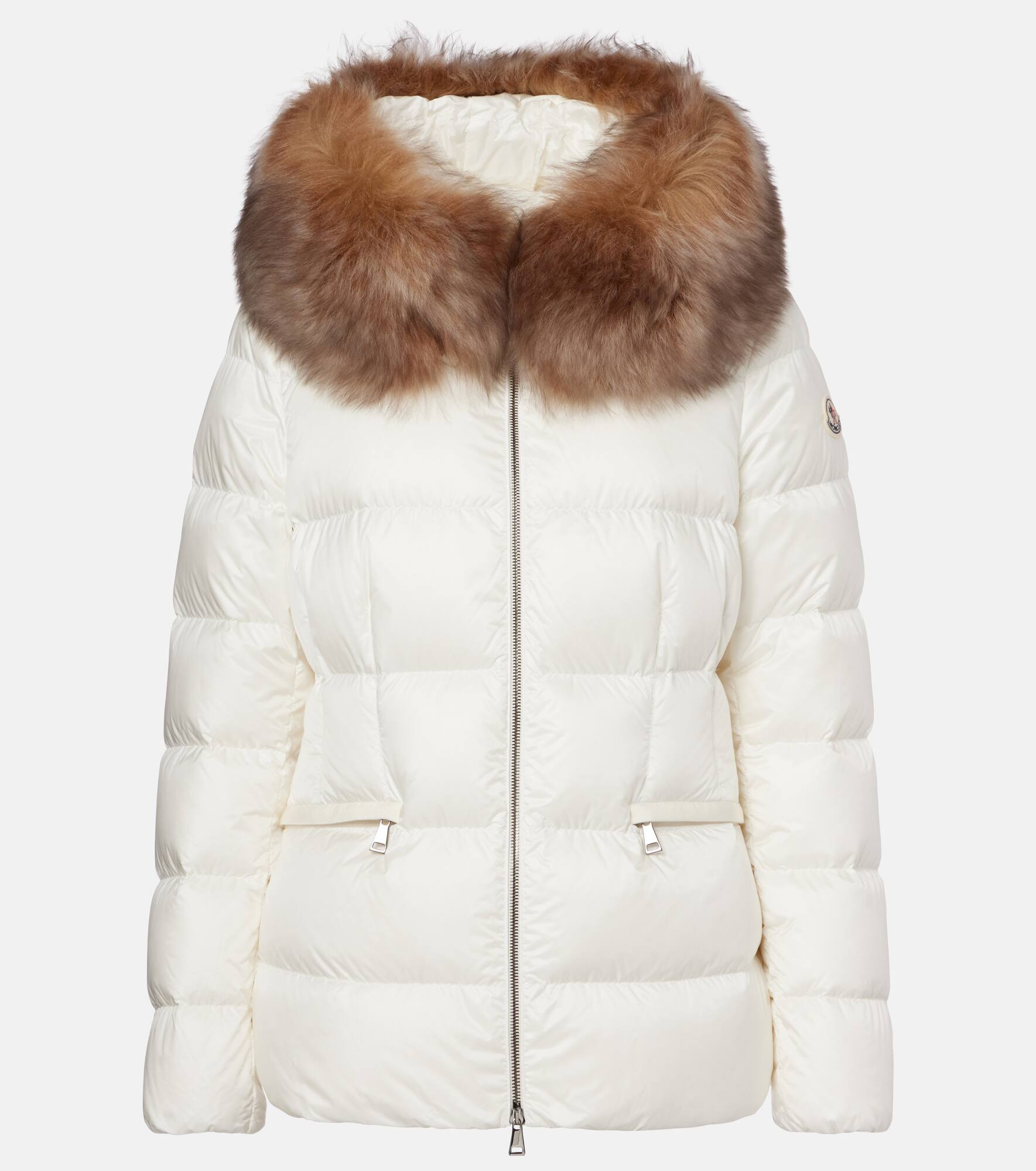 The Boed jacket from Moncler is filled with DIST-certified down and trimmed with plush shearling, offering both optimal insulation and impeccable elegance. This white silhouette is accentuated by an adjustable belted waist. Product Details - Material: 100% polyamide - Care instructions: dry clean - Made in Romania - Designer color name: Beige - Item color: beige - Lining: 100% polyamide - Lining II: 100% polyamide - Details: 100% polyester - Filling: 90% down, 10% feathers - Contains non-textile parts of animal origin - Closure: two-way zipped front - Detachable hood - Pockets: zipped pockets - Cuff: elasticated - Item number: P01068114 Size & Fit - True to size - Cinched waist - Elasticated waist - Falls below the hip - The model seen in the picture is 178cm-5'10" and wearing a size 0