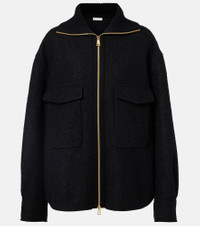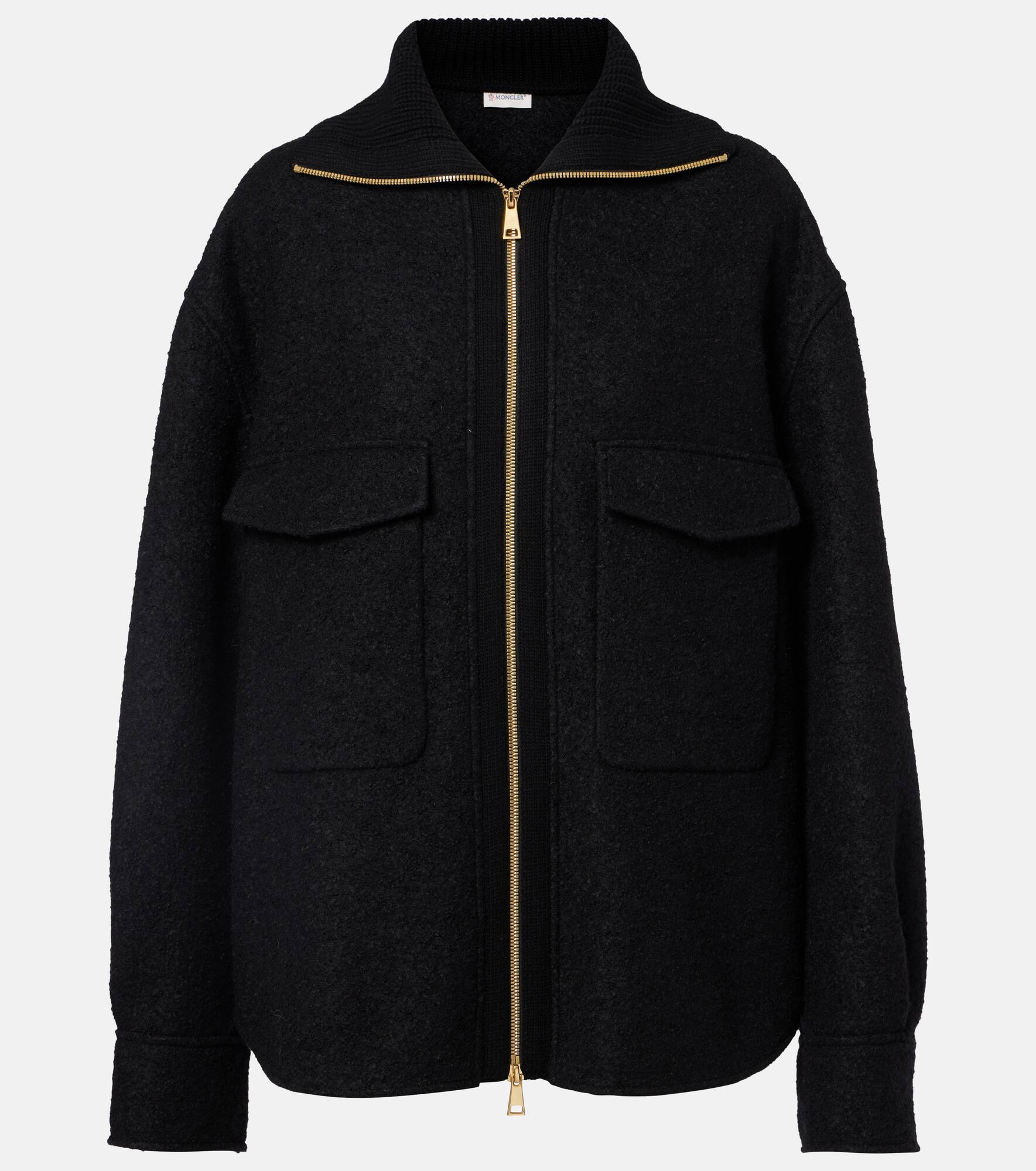 This overshirt from Moncler is made from a soft wool-blend with a boucle finish. The design is finished with double patch pockets on the front, a ribbed-knit collar and the signature logo patch on one sleeve. Product Details - Material: 62% wool, 28% viscose, 10% polyamide - Care instructions: dry clean - Made in Bulgaria - Designer color name: 999 - Item color: black - Details: 100% calf leather - Contains non-textile parts of animal origin - Hardware color: gold - Closure: two-way zipped front - Pockets: flap chest pockets - Cuff: two buttons - Item number: P01101174 Size & Fit - True to size - For a closer fit, we recommend taking one size down - Dropped shoulders - Oversized - Non-stretchy fabric - Falls below the hip - The model seen in the picture is 178cm-5'10" and wearing a size IT 40
