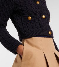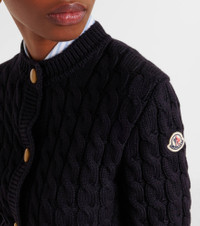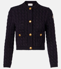 A perfect everyday building block, this cardigan from Moncler is made from a soft cotton blend. The cable-knit style is complete with gold-toned buttons and the signature logo patch at the sleeve. Product Details - Material: 68% cotton, 32% polyester - Care instructions: dry clean - Made in Bulgaria - Designer color name: Blue Navy - Item color: blue - Hardware color: gold - Closure: snap-buttoned front - Pockets: patch pockets - Collar: crewneck - Cuff: ribbed - Hem: ribbed - Item number: P01068170 Size & Fit - True to size - Dropped shoulders - Straight fit - Stretchy fabric - Cropped - The model seen in the picture is 178cm-5'10" and wearing a size XS