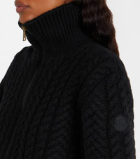 For a distinctive blend of textures, look to this zip-up cardigan from Moncler. The design is made from wool in a fine cable-knit, and finished with fuzzy trims on the hem and sleeves. Product Details - Material: 92% wool, 8% polyamide - Care instructions: dry clean - Made in Moldova - Designer color name: 999 - Item color: black - Lining: 70% polyester, 30% cotton - Lining II: 100% polyamide - Other inner trims: 100% polyamide - Filling: 100% polyester - Material II: 70% polyester, 30% cotton - Material III: 100% polyester - Closure: two-way zipped front, snap-buttoned sides - Hem: ribbed - Item number: P01101146 Size & Fit - True to size - Straight fit - Slightly stretchy fabric - Falls to the hip - The model seen in the picture is 178cm-5'10" and wearing a size XS
