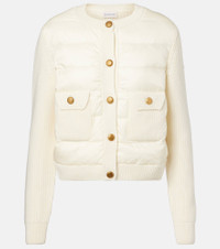 Look to Moncler for trans-seasonal layering, courtesy of this cream-white cardigan. This style is paneled with insulating down and enhanced by the brand's signature Tricot knit in virgin wool for an extra touch of softness. Product Details - Material: 100% polyamide - Care instructions: dry clean - Made in Moldova - Designer color name: 050 - Item color: white - Hardware color: antique gold - Material II: 100% virgin wool - Lining: 100% polyamide - Filling: 90% down, 10% feathers - Contains non-textile parts of animal origin - Closure: buttoned front - Collar: crewneck - Pockets: flap pockets - Hem: ribbed - Item number: P01098728 Size & Fit - True to size - Straight fit - Partly stretchy fabric - Slightly cropped - The model seen in the picture is 178cm-5'10" and wearing a size XS