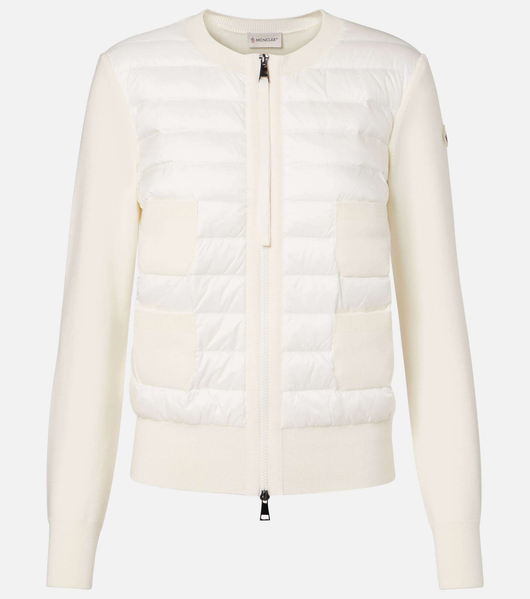 This jacket, with its woven virgin wool sleeves and down-filled front, is a signature Moncler style. The versatile piece can be worn as a warming layer or as a standalone piece of outerwear. Product Details - Material: 100% polyamide - Care instructions: dry clean - Made in Moldova - Designer color name: 0 - Item color: white - Material II: 100% virgin wool - Lining: 100% polyamide - Filling: 90% down, 10% feathers - Contains non-textile parts of animal origin - Closure: two-way zipped front - Pockets: patch pockets - Collar: crewneck - Cuff: ribbed - Hem: ribbed - Item number: P01074049 Size & Fit - True to size - Straight fit - Elasticated hem - Partly stretchy fabric - Falls to the hip - The model seen in the picture is 178cm-5'10" and wearing a size XS