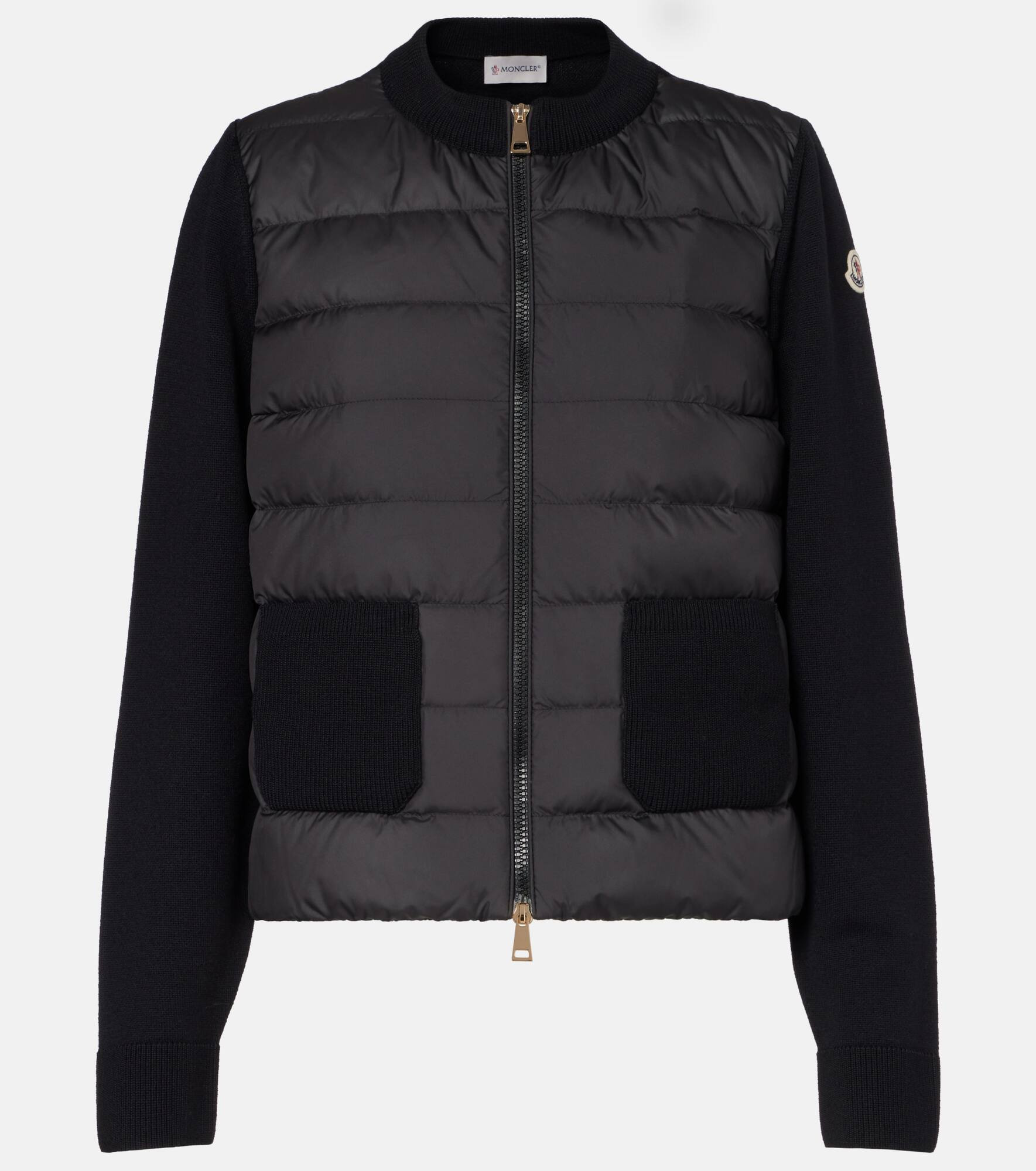 Protect yourself from the cold with this Moncler cardigan, combining warm virgin wool fibers with insulating down inserts on the front and collar. This zip-up style is ideal as an under or outer layer. Product Details - Material: 100% polyester - Care instructions: dry clean - Made in Moldova - Designer color name: 999 - Item color: black - Material II: 100% virgin wool - Lining: 100% polyester - Filling: 90% down, 10% feathers - Contains non-textile parts of animal origin - Hardware color: gold - Collar: crewneck - Closure: two-way zipped front - Pockets: patch pockets - Cuff: ribbed - Hem: ribbed - Item number: P01101136 Size & Fit - True to size - Straight fit - Partly stretchy fabric - Falls to the hip - The model seen in the picture is 178cm-5'10" and wearing a size XS