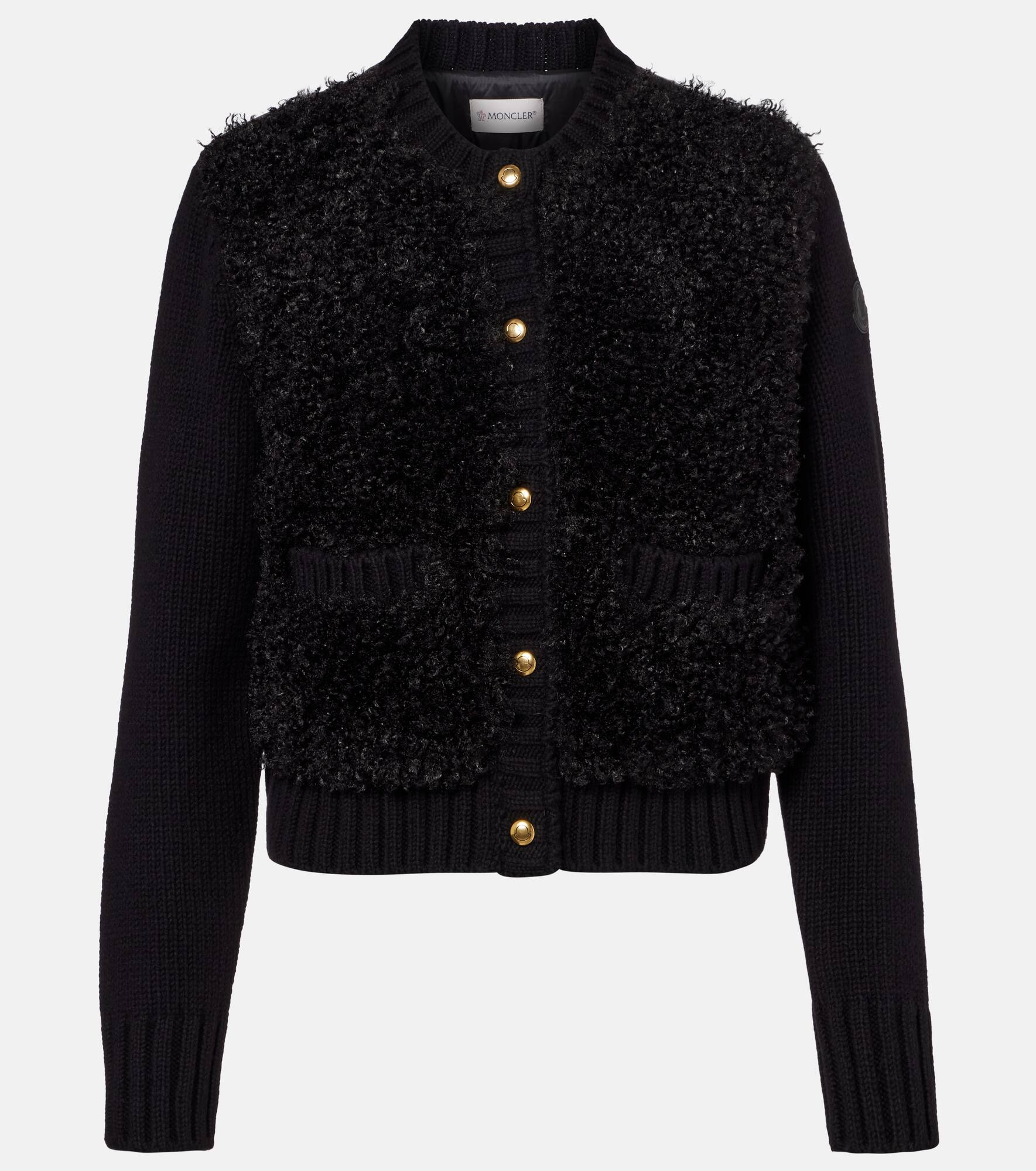 This cardigan from Moncler blends a wool construction with soft teddy on the front, creating a cozy and comfortable staple. The design is complete with a down-paneled back for added insulation. Product Details - Material: 100% polyamide - Care instructions: dry clean - Made in Romania - Designer color name: 999 - Item color: black - Hardware color: gold - Material II: 100% polyester - Material III: 100% virgin wool - Lining: 100% polyamide - Lining II: 100% polyamide - Filling: 90% down, 10% feathers - Contains non-textile parts of animal origin - Details: 100% calf leather - Closure: snap-buttoned front - Cuff: ribbed - Hem: ribbed - Item number: P01101143 Size & Fit - True to size - Straight fit - Partly stretchy fabric - Falls to the hip - The model seen in the picture is 178cm-5'10" and wearing a size XS