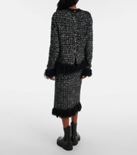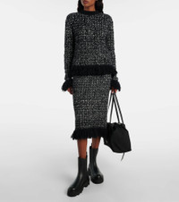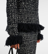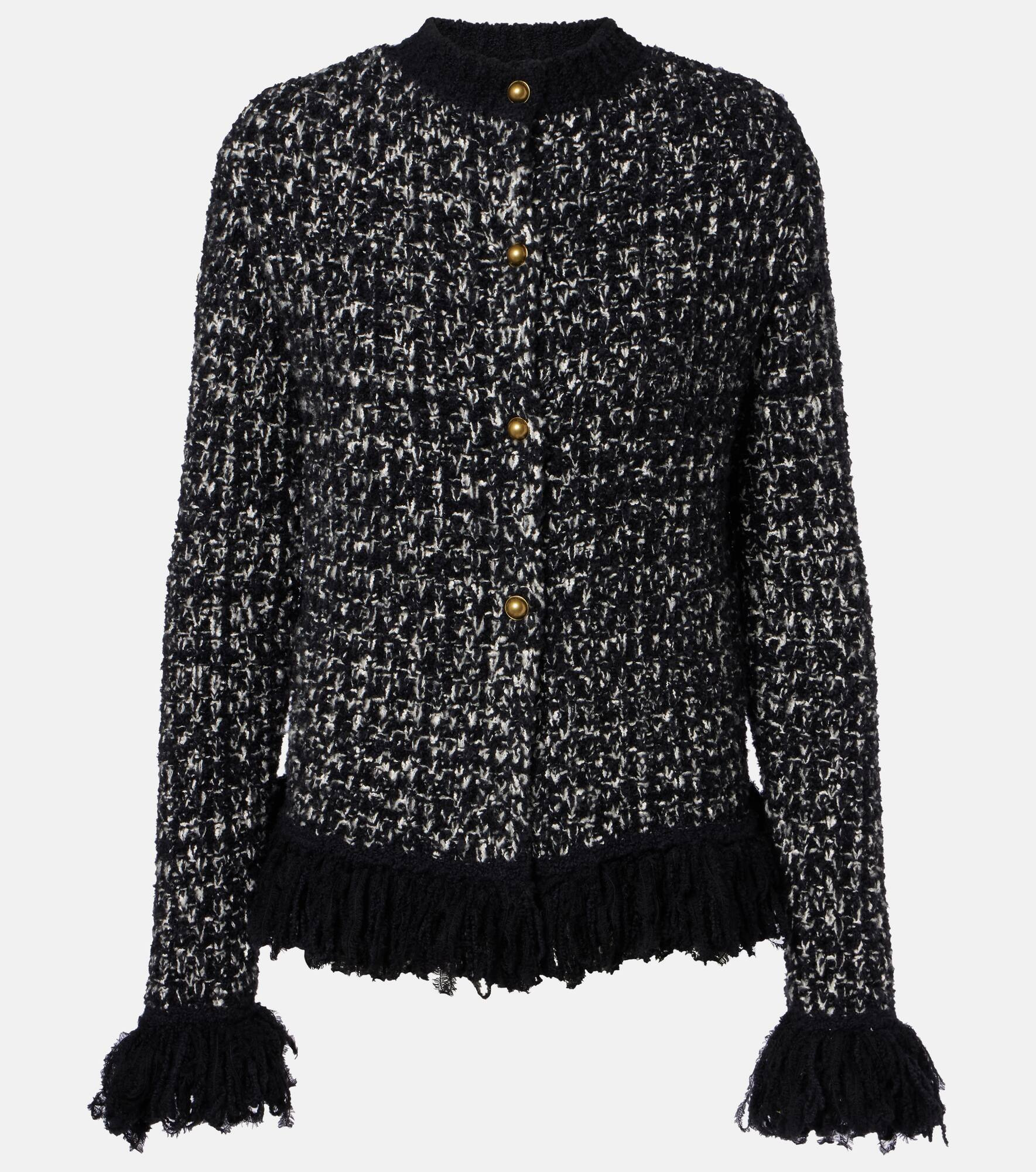An interplay of textures and colors, this cardigan by Moncler promises comfort and elegance at once. Knitted from wool-blend mouline, the design is complete with a fringed trim and gold-toned buttons. Product Details - Material: 68% wool, 19% polyamide, 13% cotton - Care instructions: dry clean - Made in Italy - Designer color name: P90 - Item color: black, white - Closure: button fastening - Insert: 100% calf leather - Contains non-textile parts of animal origin - Item number: P01101150 Size & Fit - True to size - Straight fit - Slightly stretchy fabric - Falls to the hip - The model seen in the picture is 178cm-5'10" and wearing a size XS