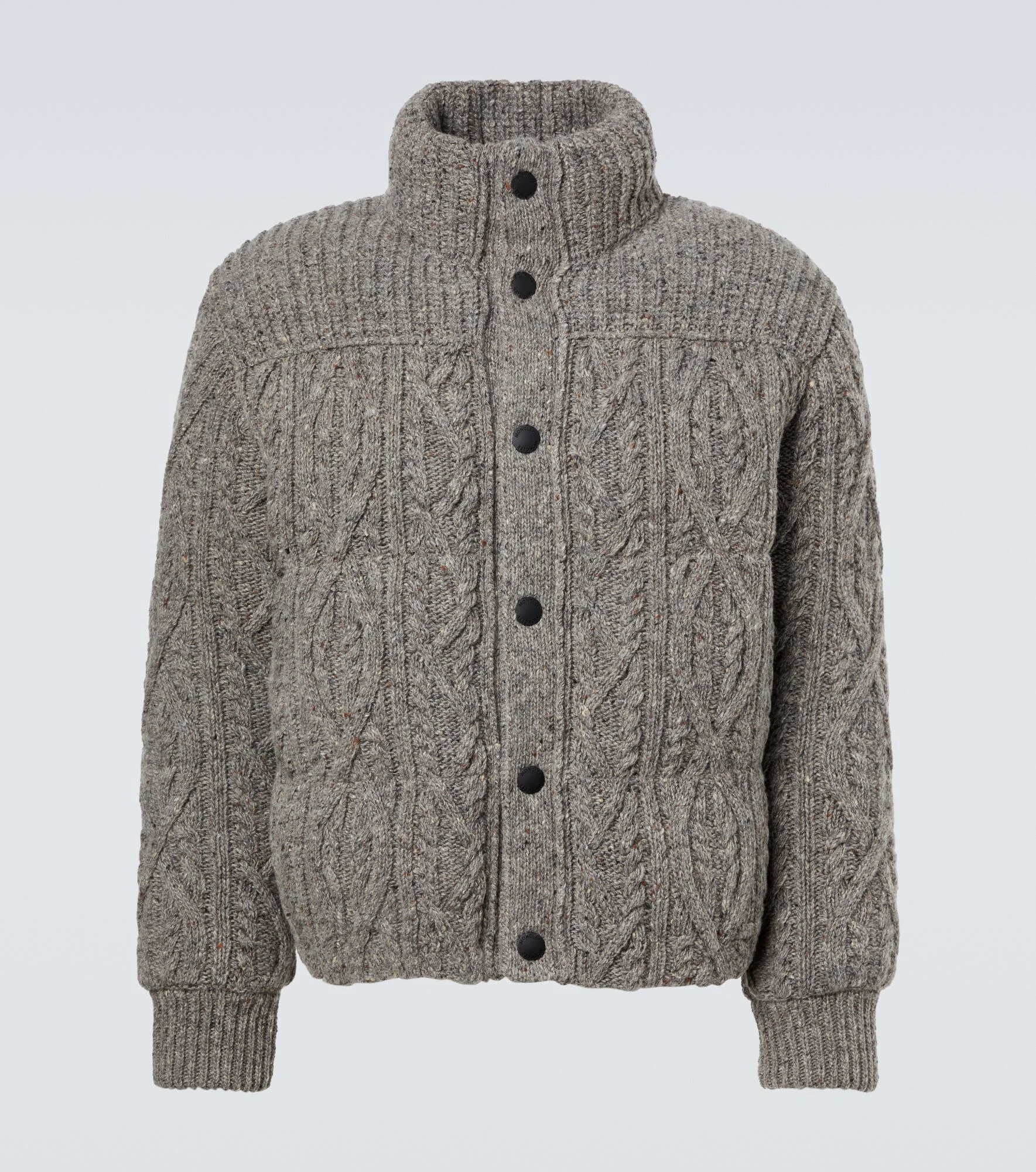Committed to precision and performance on the slopes, Moncler Grenoble champions technical and innovative skiwear. This down jacket from the Apres Ski collection is knitted from virgin wool, and showcases a cardigan-style silhouette. Product Details - Material: 100% virgin wool - Care instructions: dry clean - Made in Romania - Designer color name: Light Gray Melange - Item color: gray - Lining: 100% polyamide - Filling: 100% polyester - Filling II: 90% down, 10% goose feathers - Contains non-textile parts of animal origin - Pockets: side slit pockets - Closure: snap-buttoned front - Item number: P01068555 Size & Fit - True to size - Straight fit - Non-stretchy fabric - Falls to the hip - Height of model is 189cm-74.5" and wears a size L