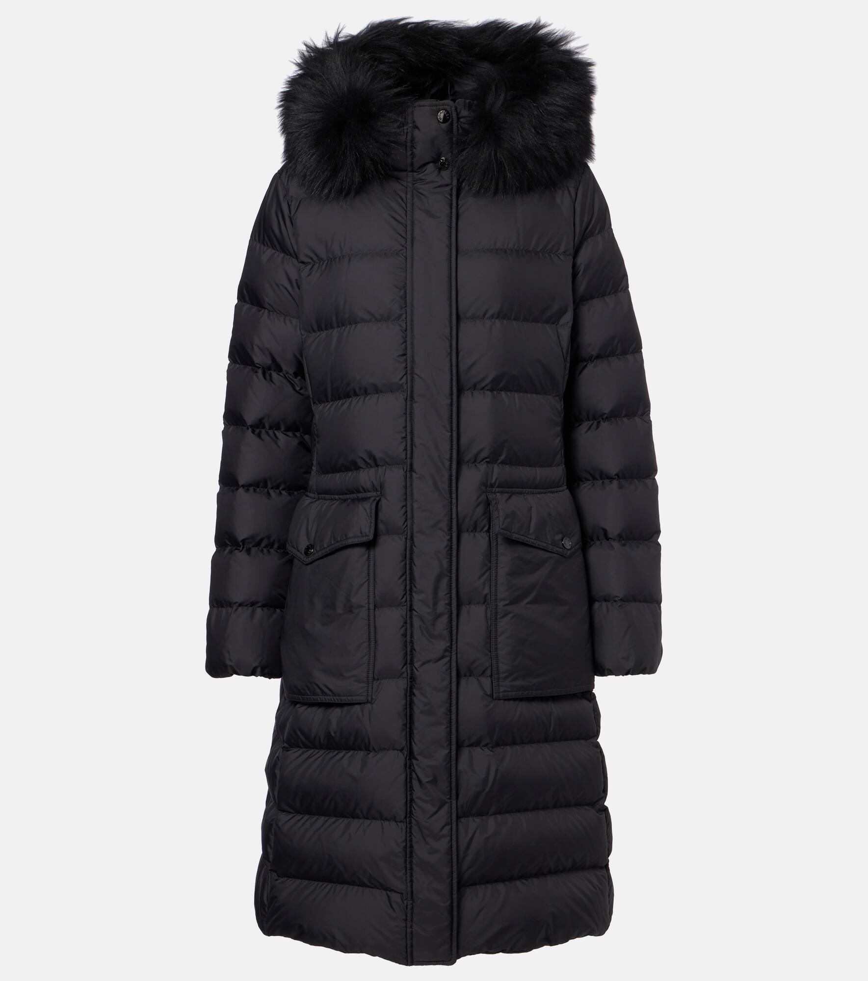 The Moncler long down jacket is a cold-weather essential, designed with a detachable shearling hood, flap pockets, and a concealed two-way zip closure with buttons. Functional details meet the brand’s signature style for effortless seasonal wear. Product Details - Material: 100% polyamide - Care instructions: machine wash at 30 degrees - Made in Armenia - Designer color name: Black - Item color: black - Lining: 100% polyamide - Lining II: 100% polyamide - Trim: 100% shearling - Filling: 90% down, 10% feathers - Contains non-textile parts of animal origin - Closure: two-way zipped front with snap-button fastenings - Pockets: flap pockets - Cuff: elasticated - Detachable hood - Detachable belt - Belt loops - Elasticated waistband - Item number: P01068162 Size & Fit - True to size - Cinched waist - Non-stretchy fabric - The model seen in the picture is 178cm-5'10" and wearing a size 0