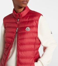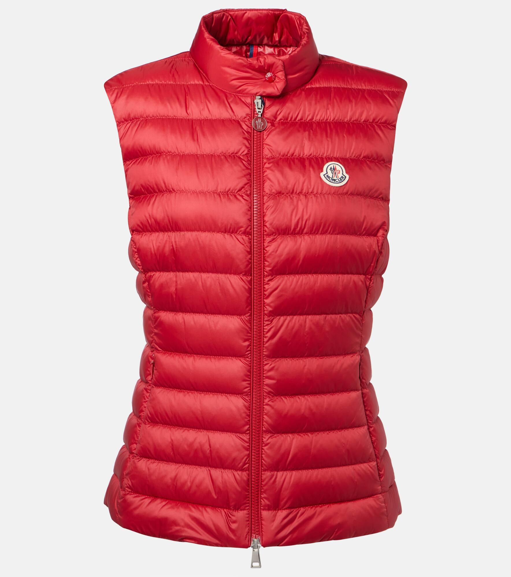 This down vest showcases the brand's logo on an embossed patch on the chest. Exclusively sourced from DIST-certified suppliers, all Moncler down is derived from farmed geese as a byproduct of the food industry. Product Details - Material: 100% polyamide - Care instructions: hand wash - Made in Romania - Designer color name: Red - Item color: red - Lining: 100% polyamide - Filling: 90% down, 10% feathers - Filling II: 100% polyester - Contains non-textile parts of animal origin - Item number: P01068109 Size & Fit - True to size - Cinched waist - Non-stretchy fabric - Falls to the hip - The model seen in the picture is 178cm-5'10" and wearing a size 0