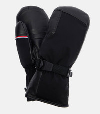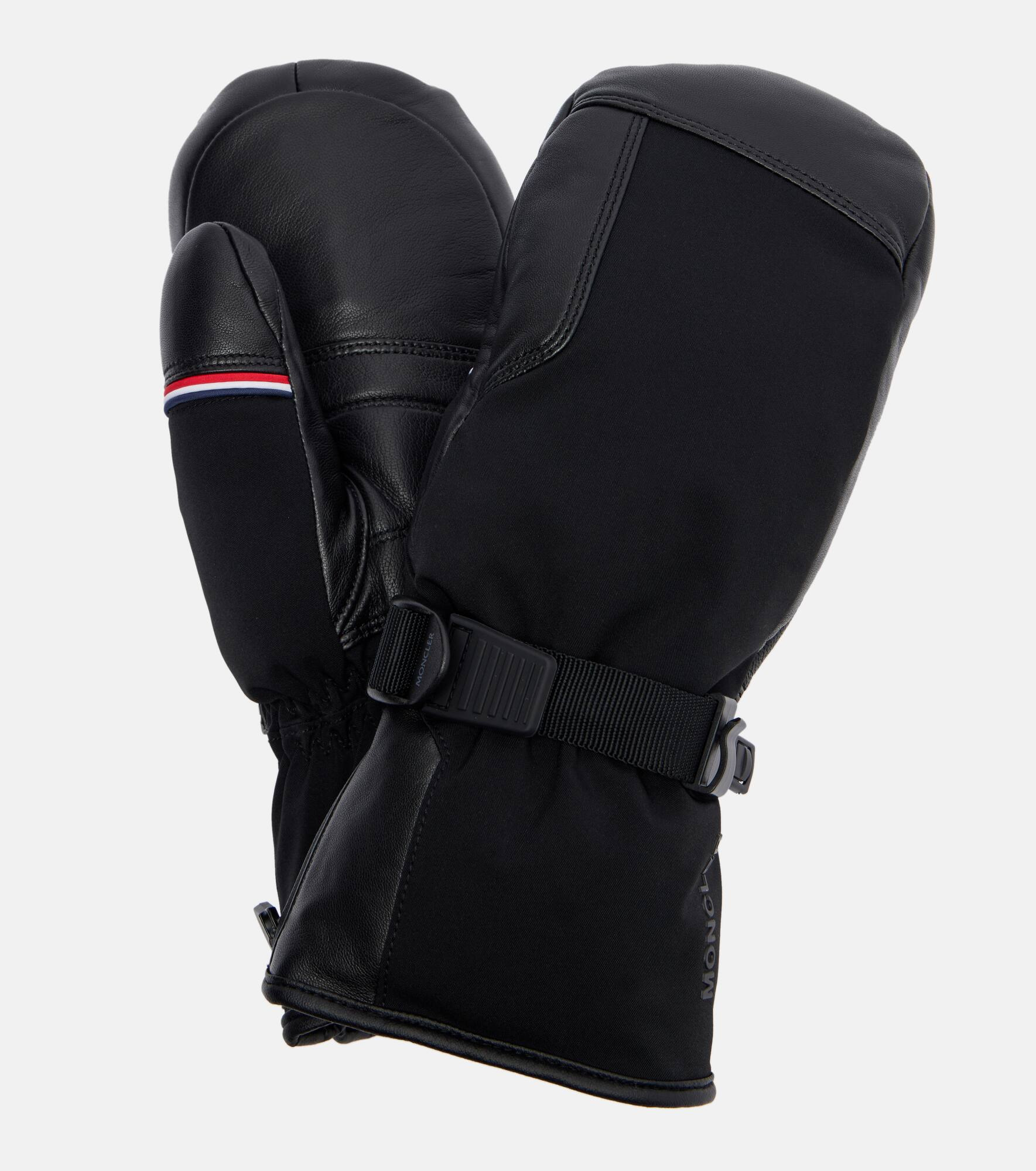 Take to the slopes in style with these ski mittens from Moncler. The pair is crafted from a water-resistant material and is complete with leather trims. Product Details - Material: 100% lamb leather - Care instructions: specialist clean - Made in Vietnam - Designer color name: 999 - Item color: black - Material II: 87% polyamide, 13% elastane - Lining: 100% polyamide - Filling: 100% polyester - Contains non-textile parts of animal origin - Closure: concealed zipped side - Item number: P01119327 Size & Fit - Length of size XS = 28cm-11" - Length of size S = 29cm-11.5" - Length of size M = 30cm-12" - Length of size L = 31cm-12" - Width of size XS = 10cm-4" - Width of size S = 10.5cm-4" - Width of size M = 11cm-4.5" - Width of size L = 11.5cm-4.5"