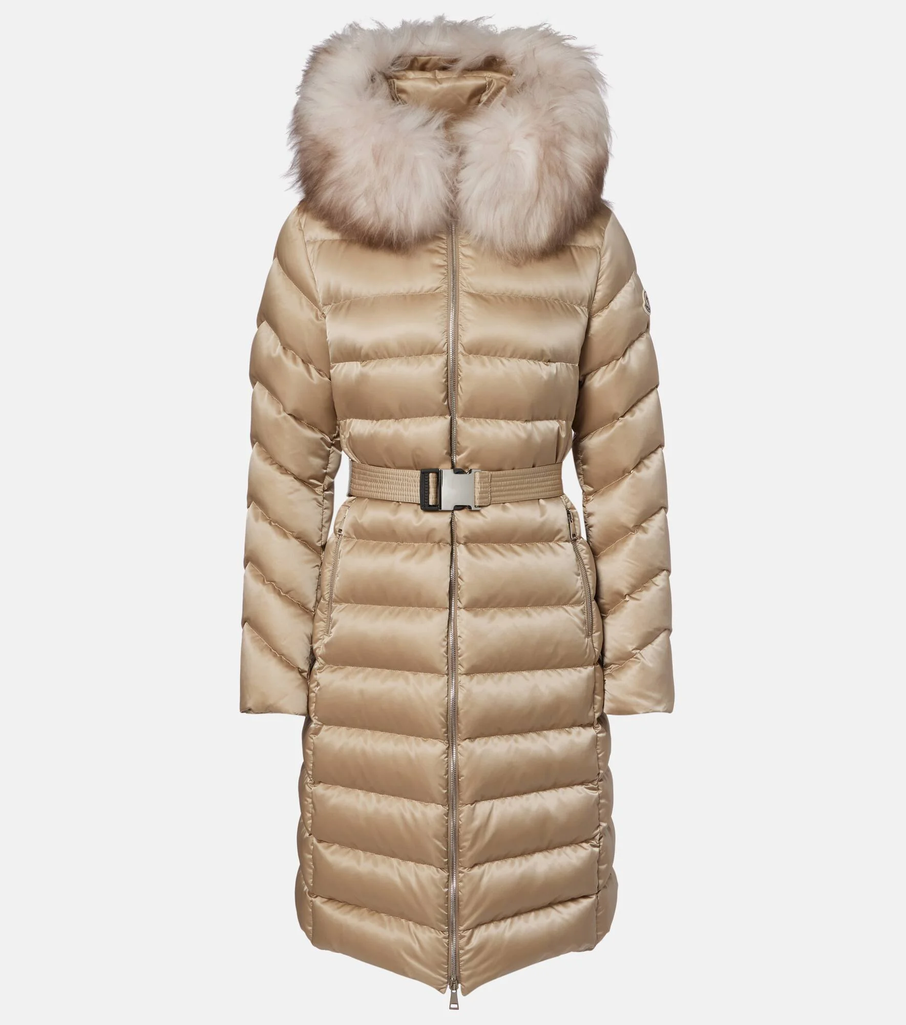 Made from a quilted technical fabric with a satin finish, the Leersie coat from Moncler provides warmth and sophistication in equal measure. Filled with insulating down, the style comes with a matching belt and a plush shearling trim. Product Details - Material: 100% polyamide - Care instructions: machine wash at 30 degrees - Made in Armenia - Designer color name: 229 - Item color: beige - Lining: 100% polyamide - Other inner trims: 100% polyamide - Trim: 100% shearling - Filling: 90% down, 10% feathers - Closure: two-way zipped front - Pockets: zipped pockets - Detachable belt - Hood - Detachable trim - Contains non-textile parts of animal origin - Item number: P01101161 Size & Fit - True to size - For a looser fit, we recommend taking one size up - Cinched waist - Adjustable at the waist - Non-stretchy fabric - Falls below the hip - The model seen in the picture is 178cm-5'10" and wearing a size 0