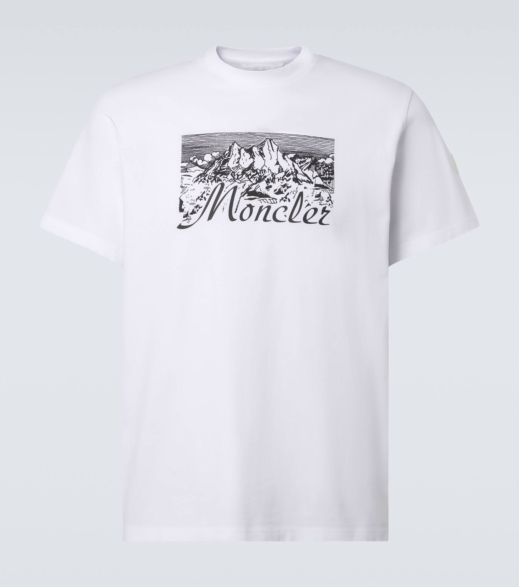 Moncler's casualwear offers timeless essentials for comfortable, year-round looks. This T-shirt is crafted from cotton poplin and showcases the signature logo embroidery on the sleeve and a mountain-inspired logo print, reflecting the brand's alpine roots. Product Details - Material: 100% cotton - Care instructions: machine wash at 30 degrees - Made in Turkey - Designer color name: Brilliant White - Item color: white, black - Collar: crewneck - Item number: P01068492 Size & Fit - True to size - Designed for a loose fit - Non-stretchy fabric - Falls to the hip - Height of model is 188cm-74" and wears a size L