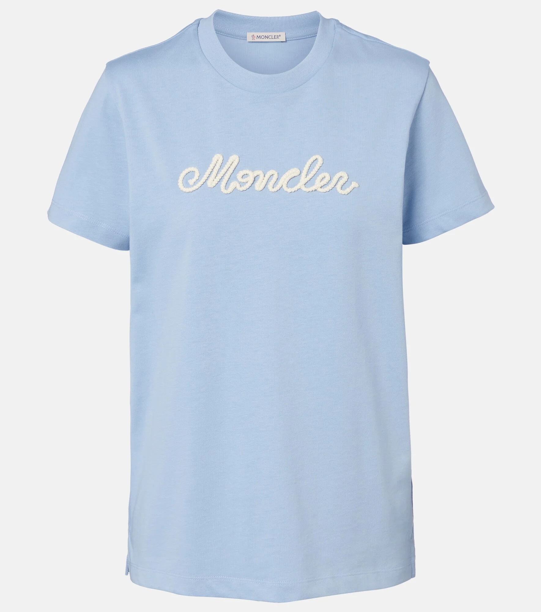 Coveted for high-performance outerwear, Moncler expands its collections with elevated everyday staples. This T-shirt is made from cotton jersey and detailed with an embroidered logo at the front. Product Details - Material: 100% cotton - Care instructions: machine wash at 30 degrees - Made in Turkey - Color: blue - Designer color name: 700 - Item number: P01141780 Size & Fit - True to size - Straight fit - Non-stretchy fabric - Falls to the hip - The model seen in the picture is 178cm-5'10" and wearing a size XS
